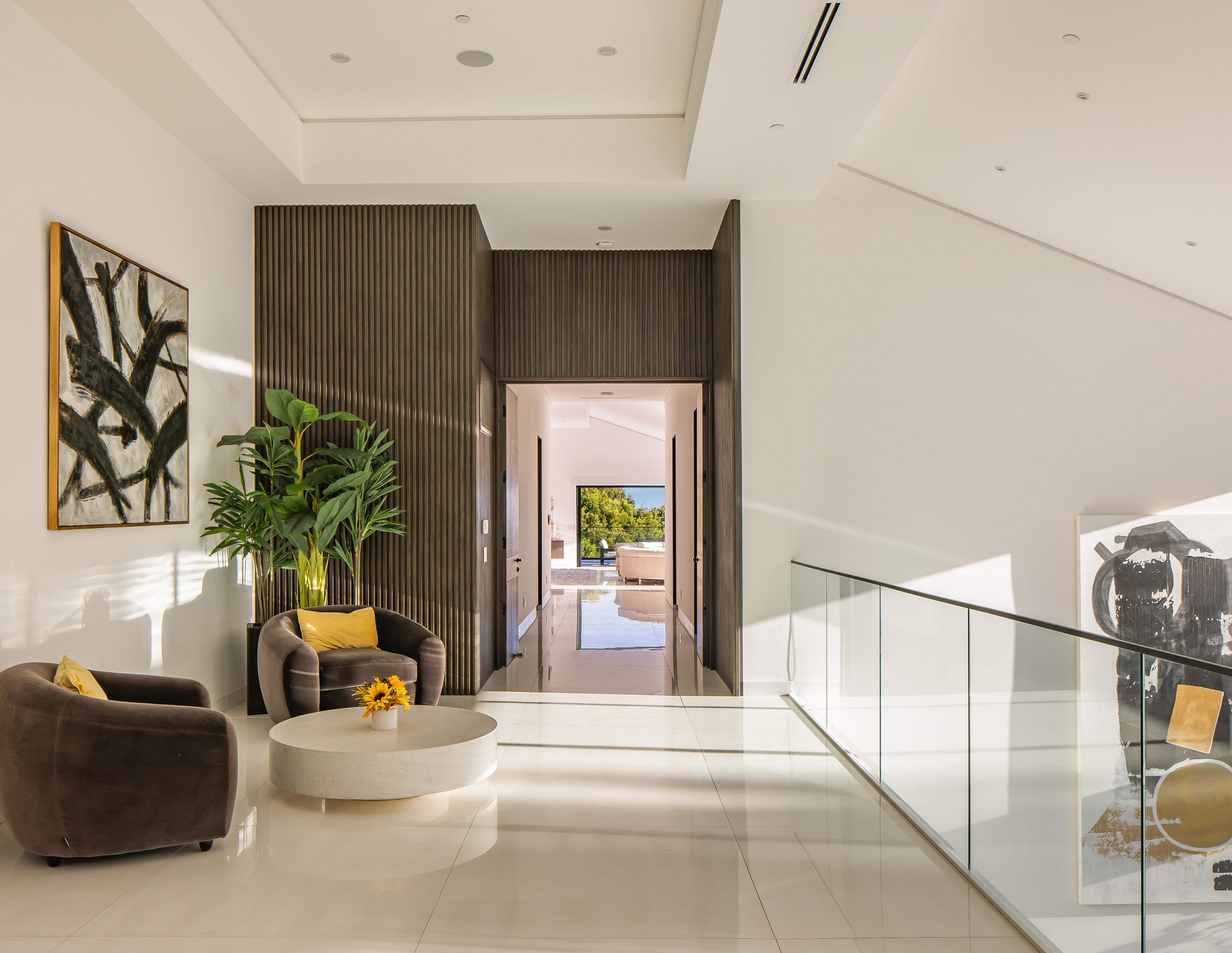The sleek newly constructed estate boasts extraordinary city views and unrivaled indoor-outdoor entertainment space with an Olympic-sized pool, screening room with 4k D-ILA Precision projector, spa with sauna, incredible sound system, plus parking for over 50 cars.