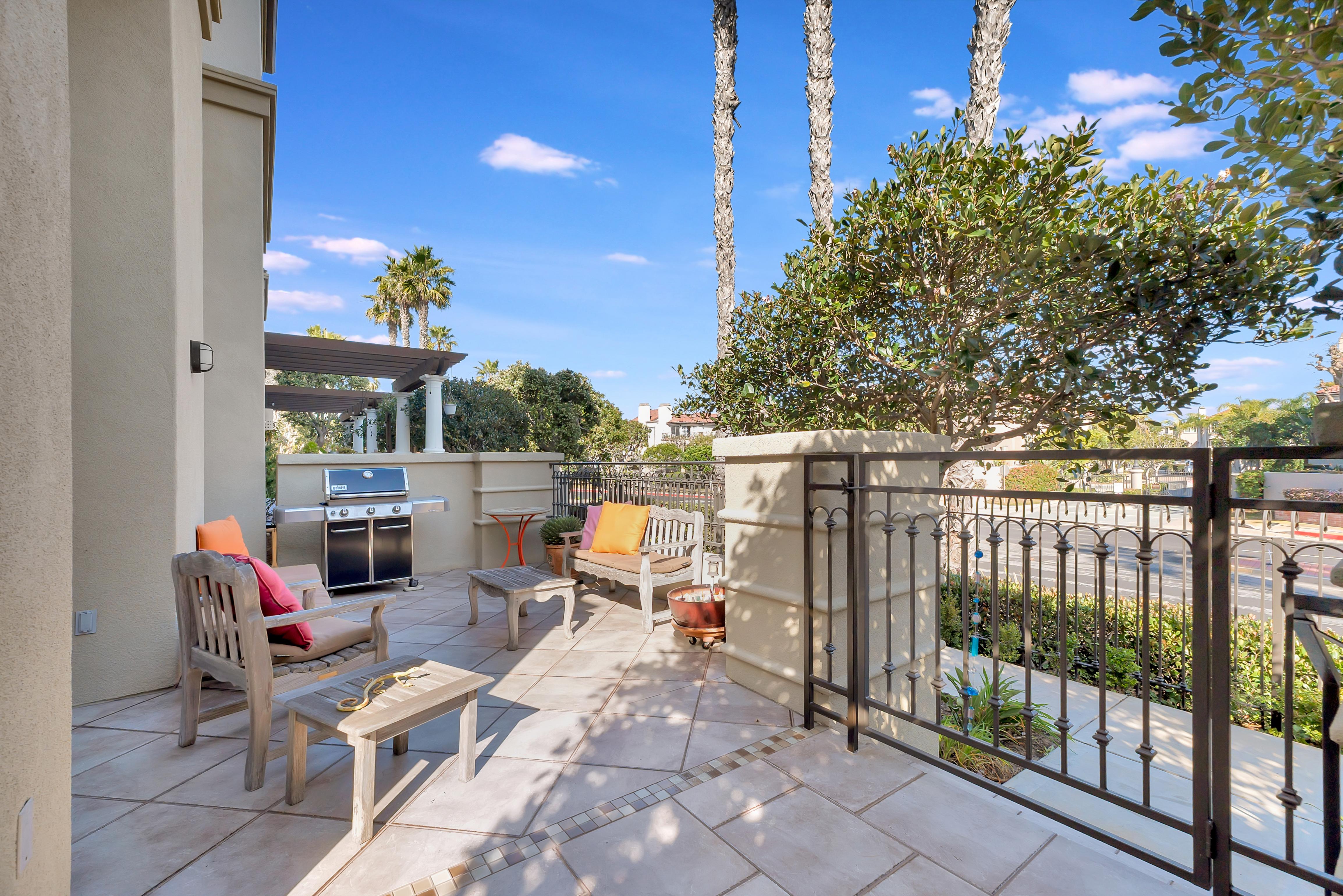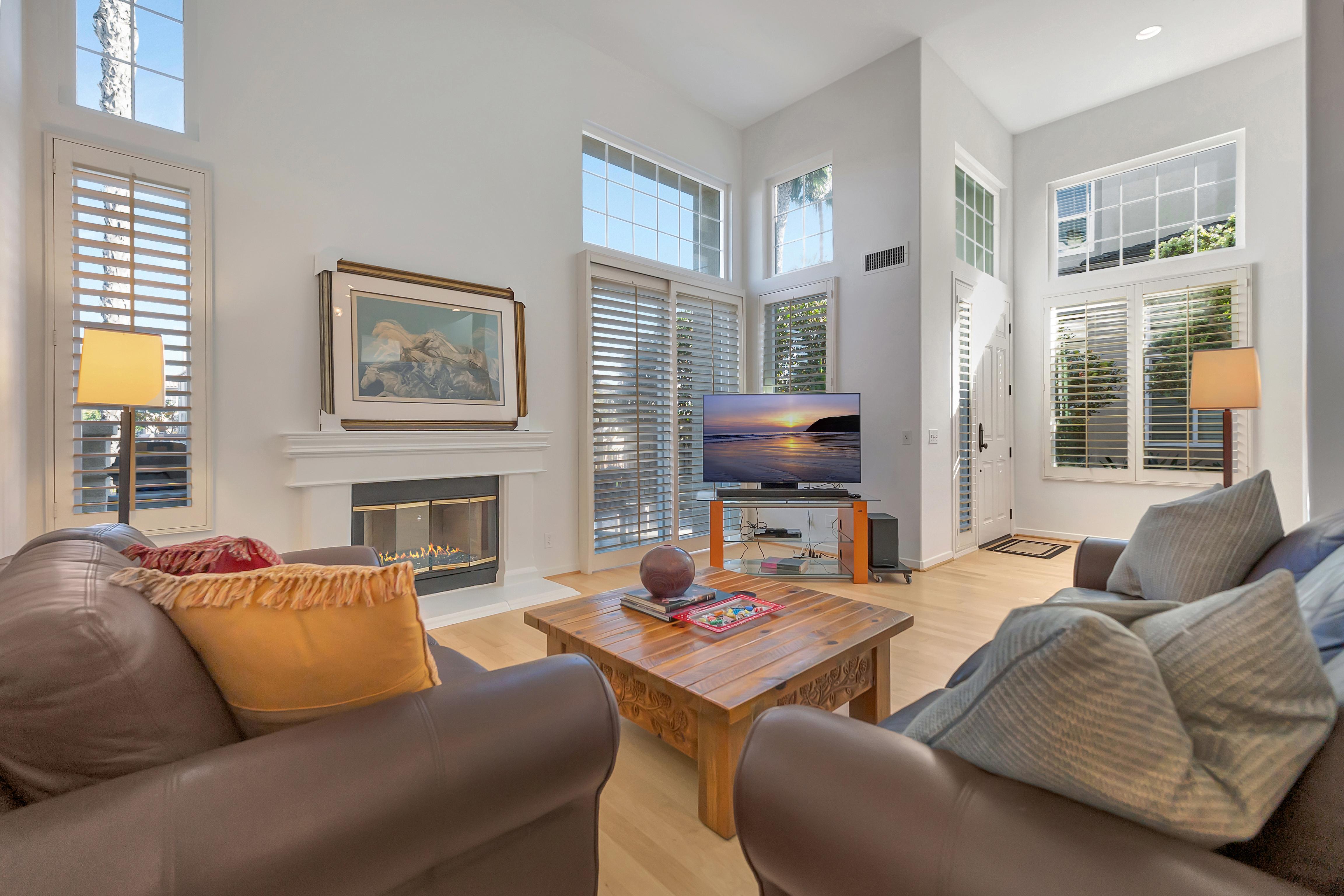 The main level features a spacious living room with a fireplace and sliding glass doors leading to a large gated front patio creating an inviting extension of the home. The formal dining room leads into the kitchen with a breakfast bar that opens to the family room and adjoining balcony.