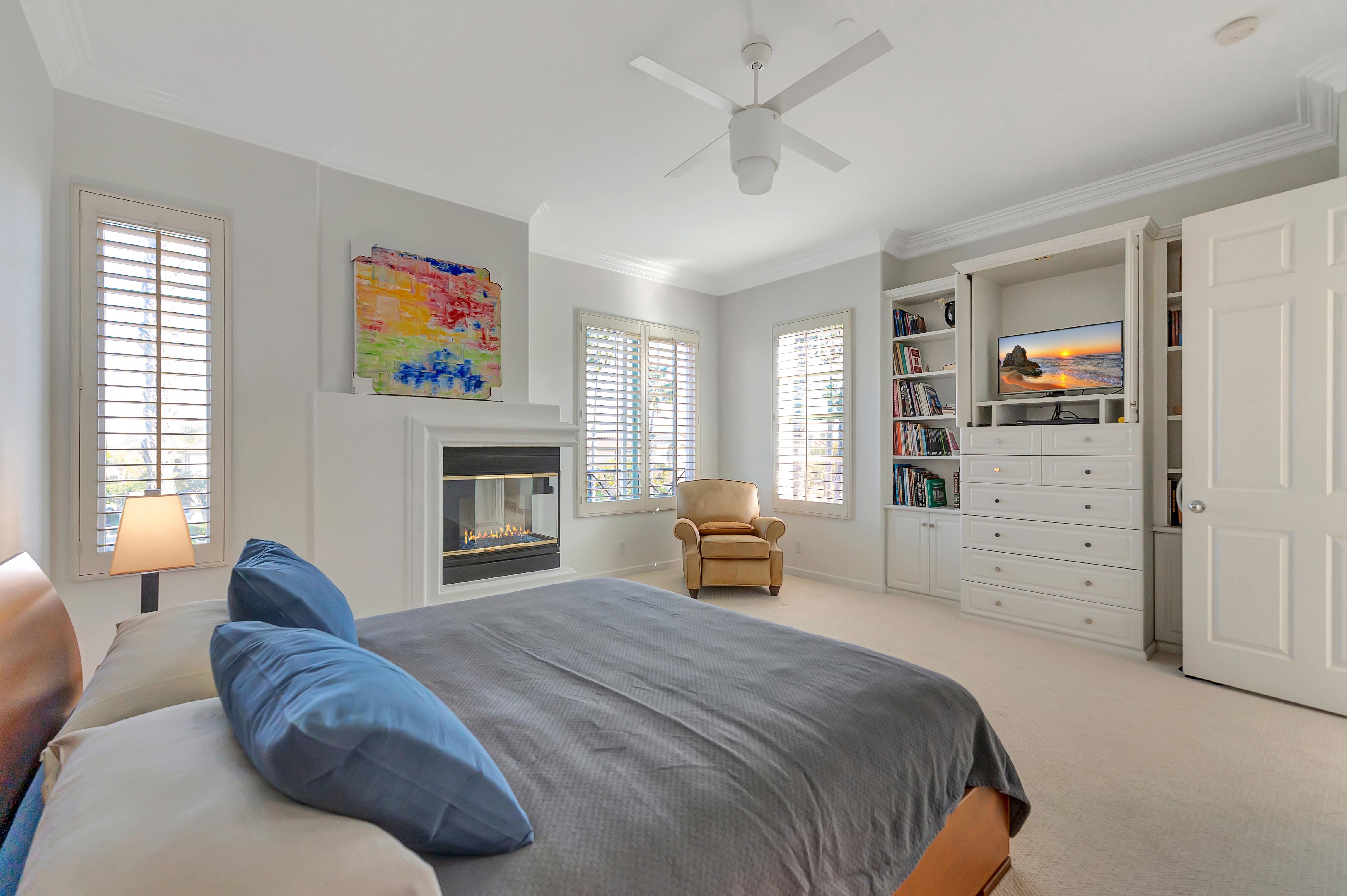Upstairs, the primary suite serves as a comfortable retreat with its own fireplace, dual sinks, a large walk-in shower, heated floors and an expansive walk-in closet. Two additional bedrooms offer ample storage and share a full bathroom with a shower and tub combination.