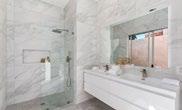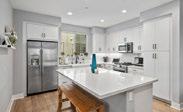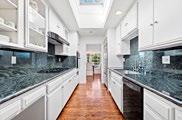 The dining area is adjacent to the living room and breakfast nook, which flow into the state-of-the-art kitchen. This chef’s studio has sharp appeal with high-caliber appliances, generous countertop and storage space, and masterful stone finishes.