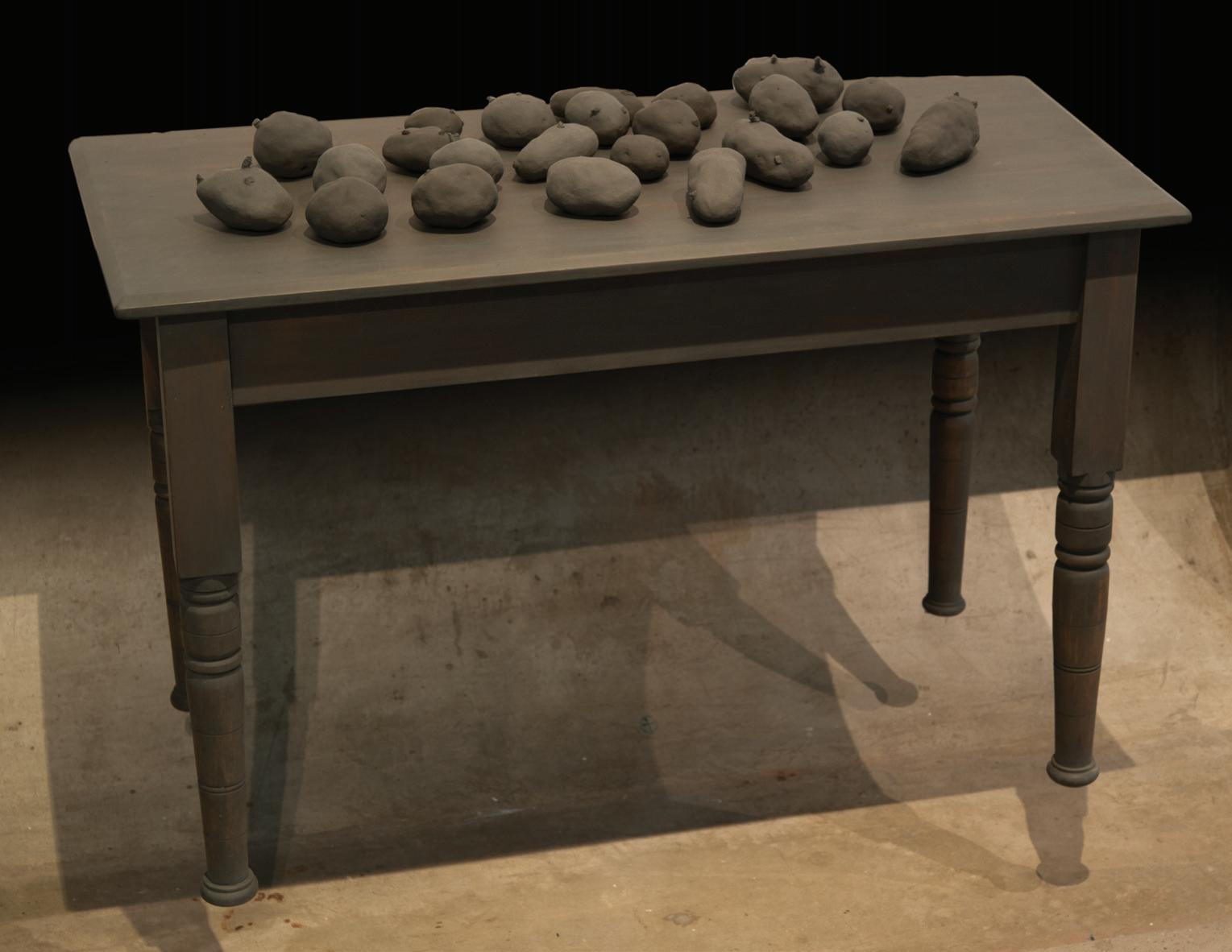 Works such as Shadow (2012) take a different direction although the influence of other artists, in this case Vincent Van Gogh, is also at play. Based on the Potato Eaters (1885) Iacobelli’s handmade terracotta potatoes on a wooden table create an atmospheric response to the lives of working poor, but proud, labourers. Often positioned nearby his large painting of a lace doily entitled The Potato Eaters (2012) sits on ceramic potato flasks. These flasks, used by Scottish and Irish migrants to conceal their drinking on the job connects this work to Australia and the practice of lace making by poor farmers reveals the pride and care taken in cultural crafts by the lower echelons of society.