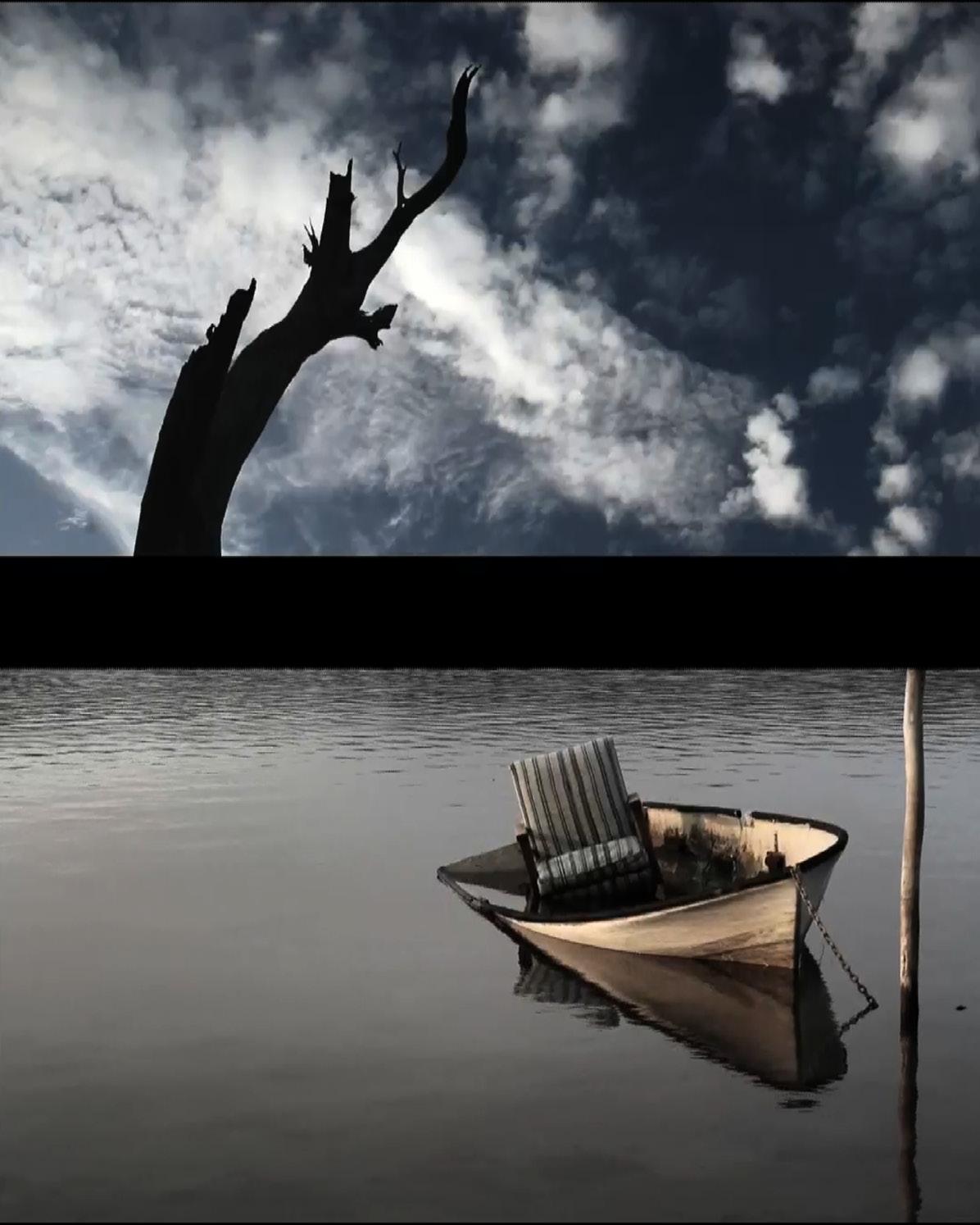 Each passing drop (2014) consists of two images that are for all intents and purposes still – a blackened tree stump silhouetted against a dark cloudy sky and an abandoned dilapidated dinghy, curiously with a chair, sinking on the tides. Qualitz’s videos are presented as photographic views that will seem familiar to most viewers. They are tranquil scenes that might tend towards cliché if it were not for the most subtle of differences, movement. These are meditative works that require an appreciation of time … and how it works both in nature and on film/ video. Not only do we notice after a time, the changing cloud patterns but also the tides upon which the boat struggles to float. Further, the subject matter of each image is evidence of time’s vagaries or more succinctly, decay. Paradoxically these “still” images are dynamic and change fills every pixel. Qualitz challenges her audiences to enter this ostensibly silent zone of motionlessness and value the energy.