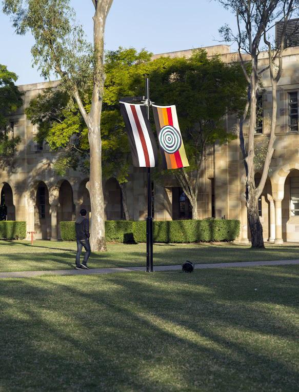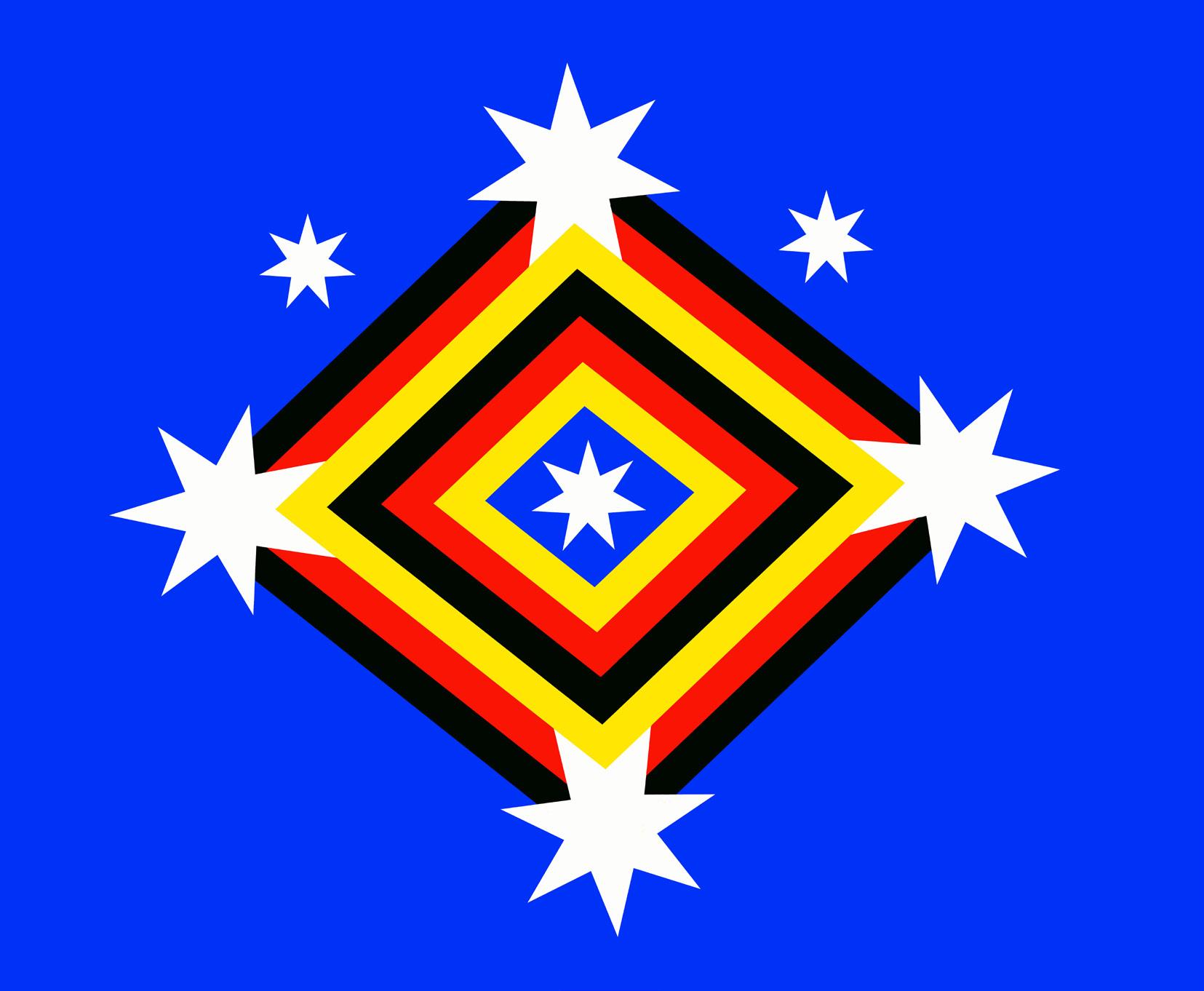 Created for a pathway leading to the central flag bearing Forgan Smith Tower at the University, Moore’s flags are fictional in the same way that Mathews’ mapping of Aboriginal nations is to some extent imagined. These “artworks masquerading as flags” consider flag protocols and reference some unique elements of the lands and cultures to which they refer. Elements of truth exist in Mathews’ research and Moore’s art works. As the artist’s taste for certain attractive designs is imprinted upon each banner, the resulting work becomes ambiguous and contradictory. Bold colours and modernist patterns raise questions in respect of the original research as well as the flag’s facility to effectively represent a certain group of people. Multi-layered issues of authenticity represented by each flag include a personal commentary addressing Moore’s fragmented identity and an uncertain ancestry.