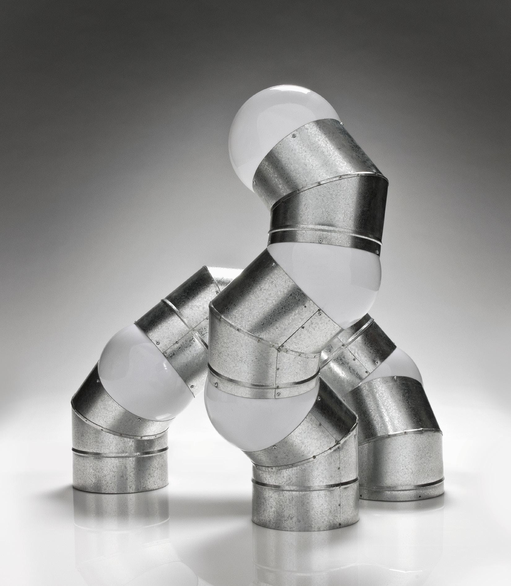 With a view to exploring the ambiguity of art and architecture Vandermark has been working on his Articulation series since 2011. Put simply these works explore the interplay between function and form, recycling and subversion of common industrial materials in order to create an ambiguous form of sculpture. The materials are aircon ducting and lighting spheres riveted together on what is a “believable coalescence”. While these are materials we would not see together in the architecture of a building as modular artworks they paradoxically give the impression of being endemic to their space of presentation. This of course will differ from space to space. In the CCAS gallery, once sleeping quarters for public servants, they are out of place and conflict with early 1980s ambience of the actual exposed air conditioning ducts. On the other hand, in a modern custom built gallery, home or office, before close scrutiny, the works appear to be part of architect’s design. Importantly, this equivocal fluidity of form and function is exactly what Vandermark wants from his works; that they comment on the spaces he has placed them in and enable audiences to experience them in changing circumstances.