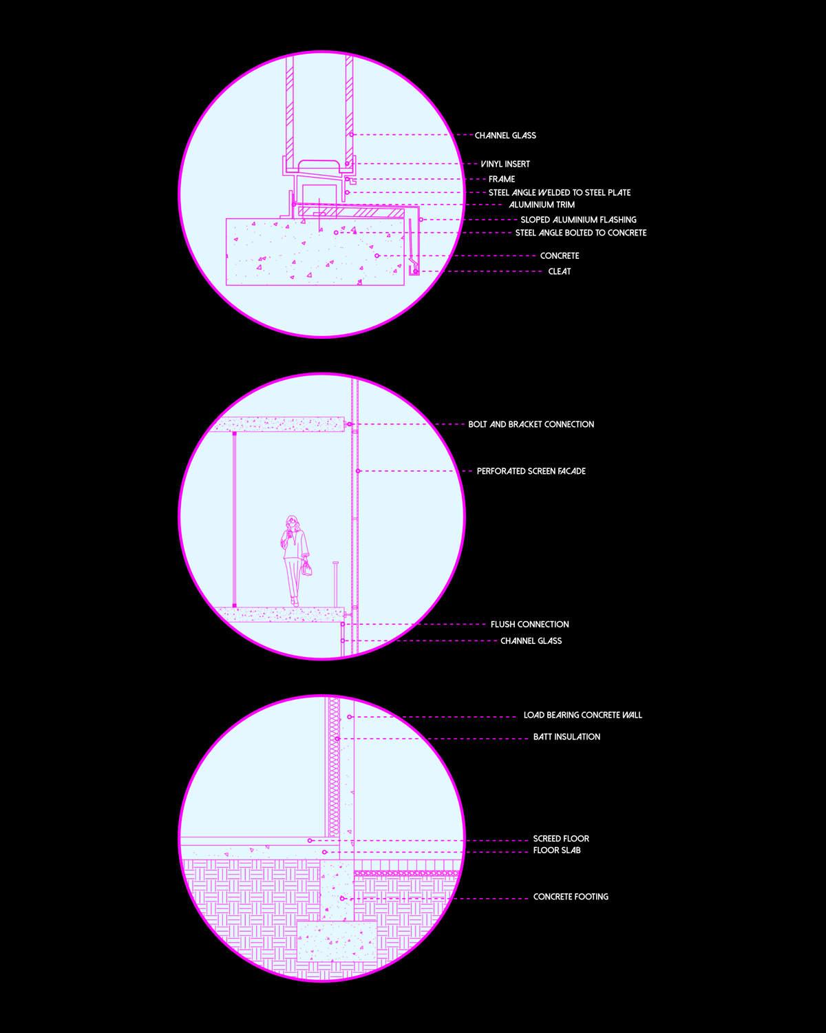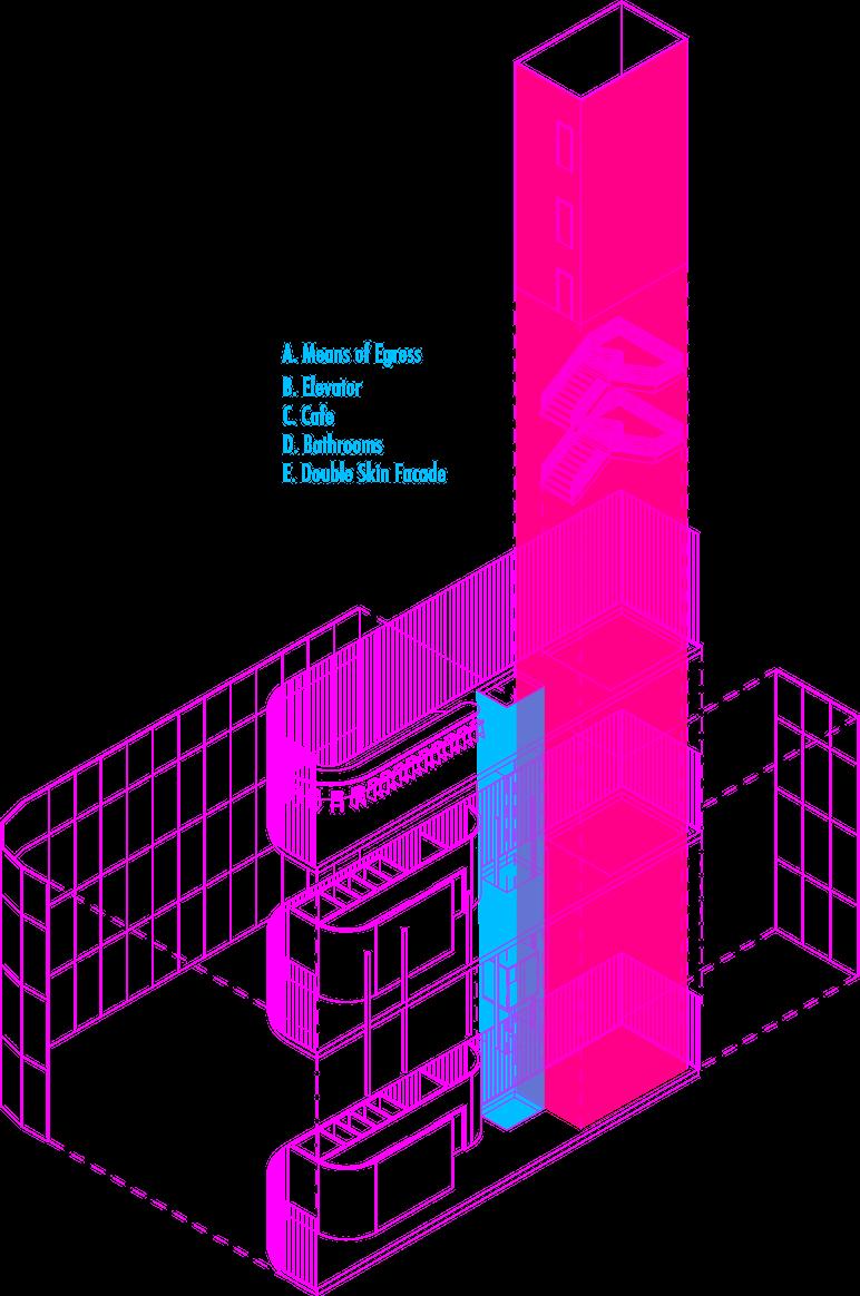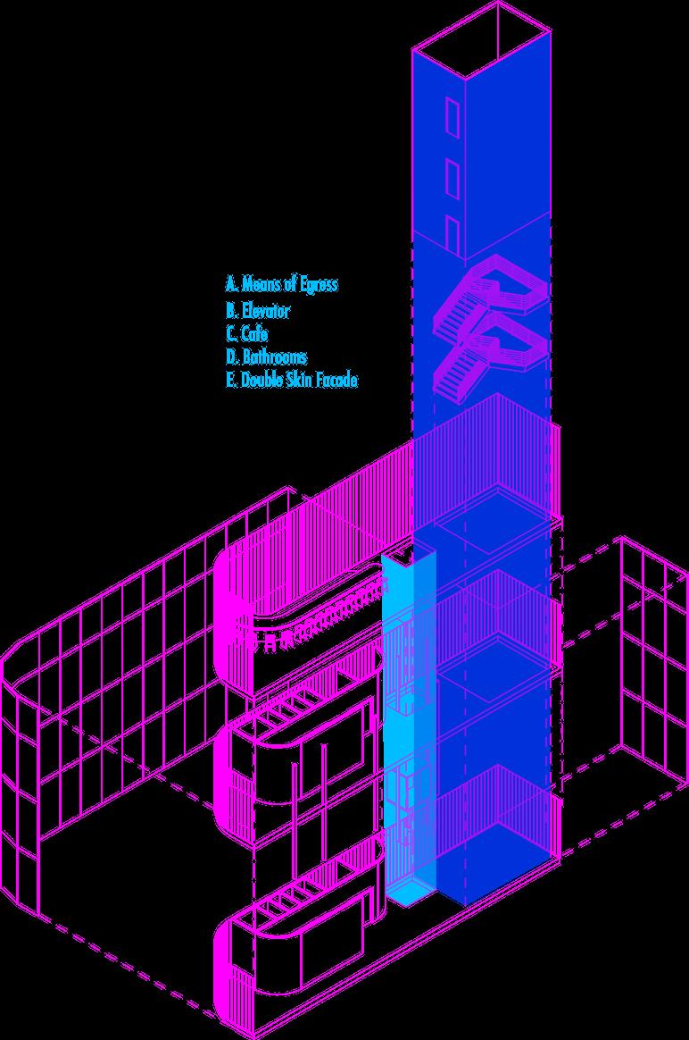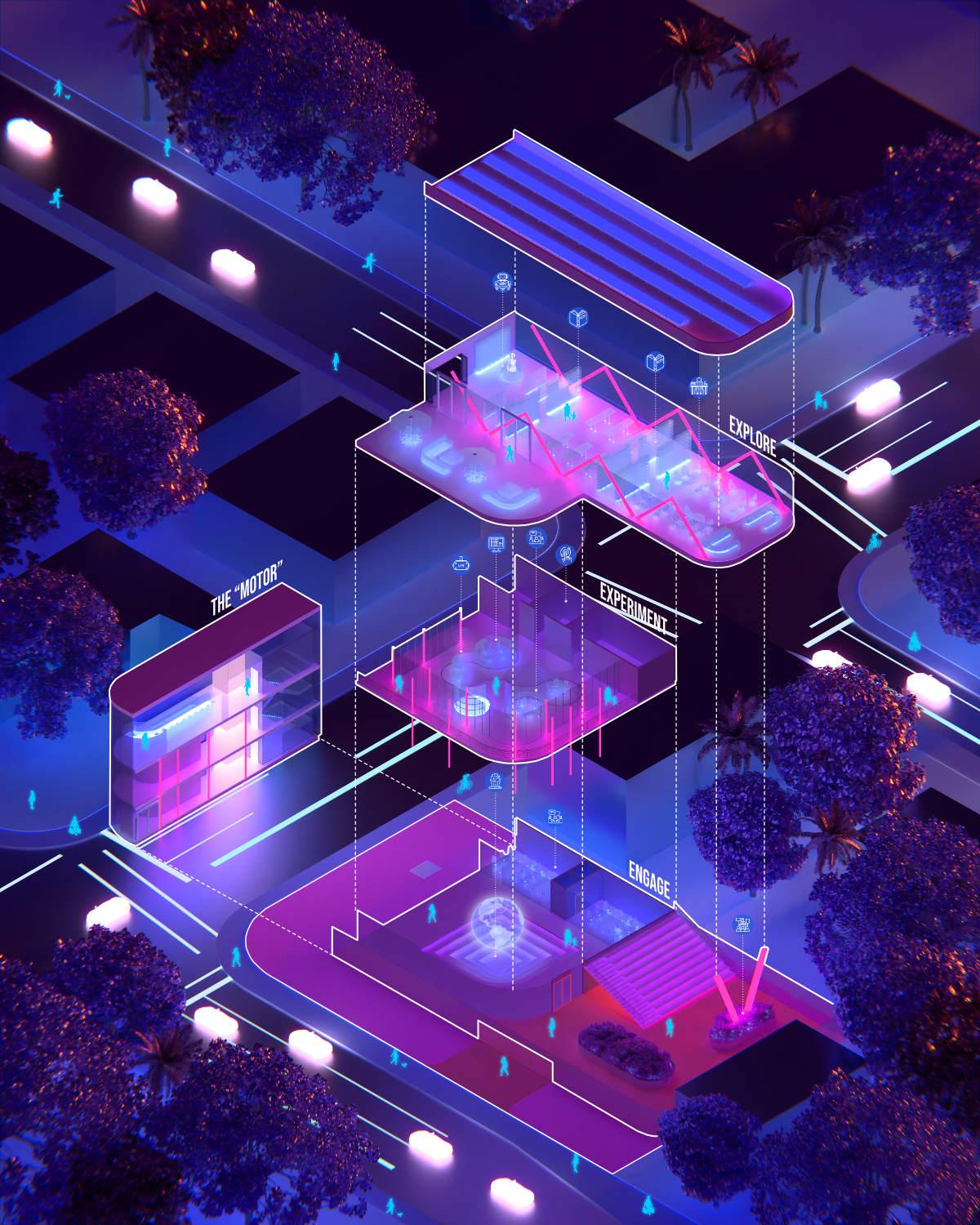 The facility is based around three main volumes with three different levels. The main volume houses the “experiment” and main interior assembly functions of the building and supports a second volume created for the purpose of “explore,” thus creating a connection between exploration of your precedents and experimentation with future methods of art and visual computation. The third volume functions as the “motor” of the building, housing all the utilitarian functions and vertical circulation of the building and thus creating a transitory space between the floors.