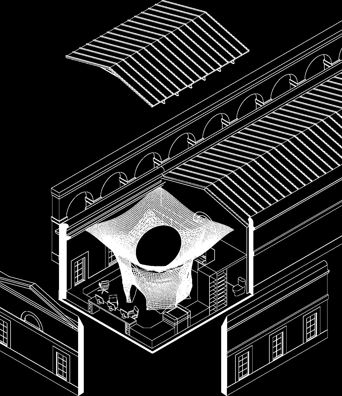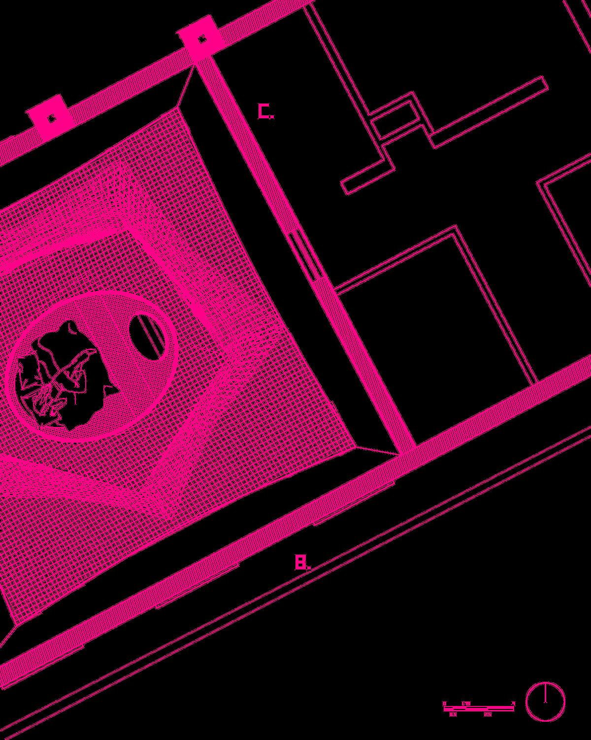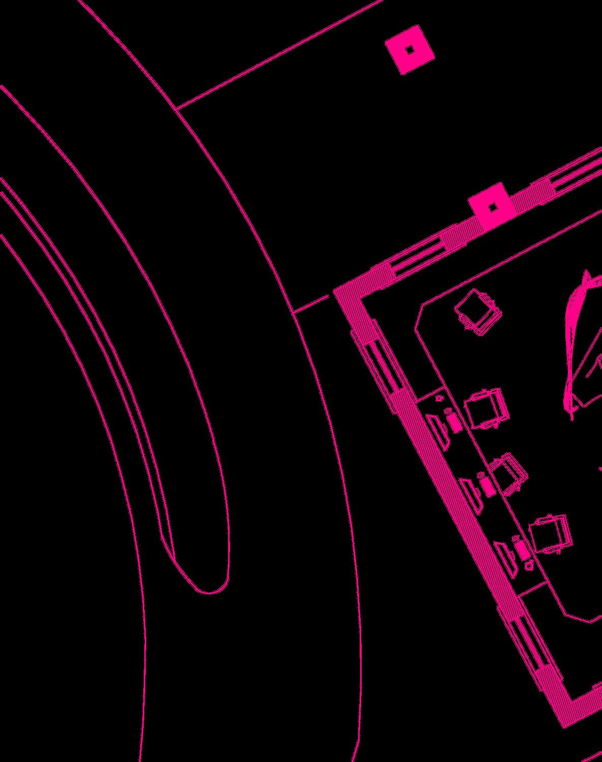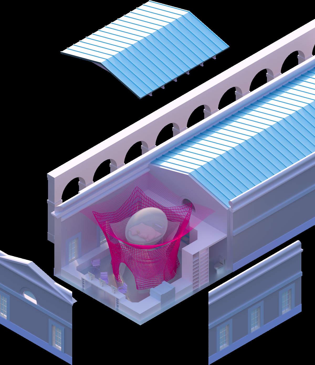 The facility is based around three main volumes with three different levels. The main volume houses the “experiment” and main interior assembly functions of the building and supports a second volume created for the purpose of “explore,” thus creating a connection between exploration of your precedents and experimentation with future methods of art and visual computation. The third volume functions as the “motor” of the building, housing all the utilitarian functions and vertical circulation of the building and thus creating a transitory space between the floors.