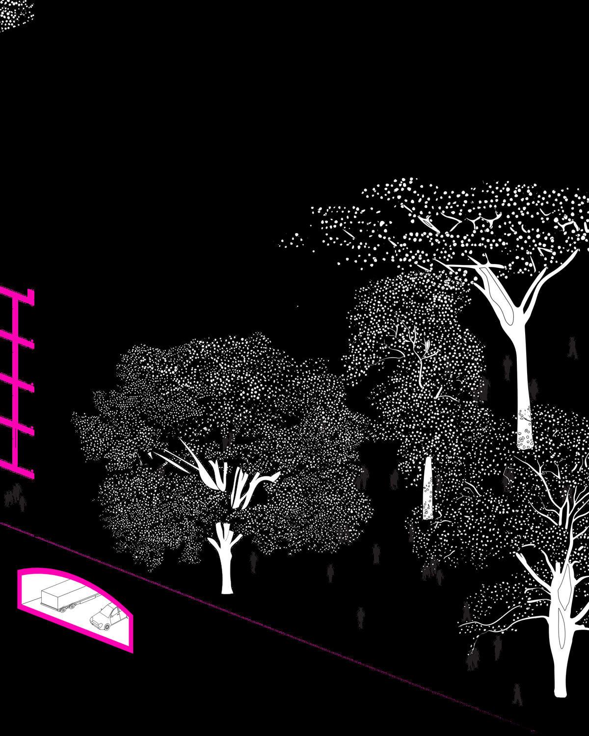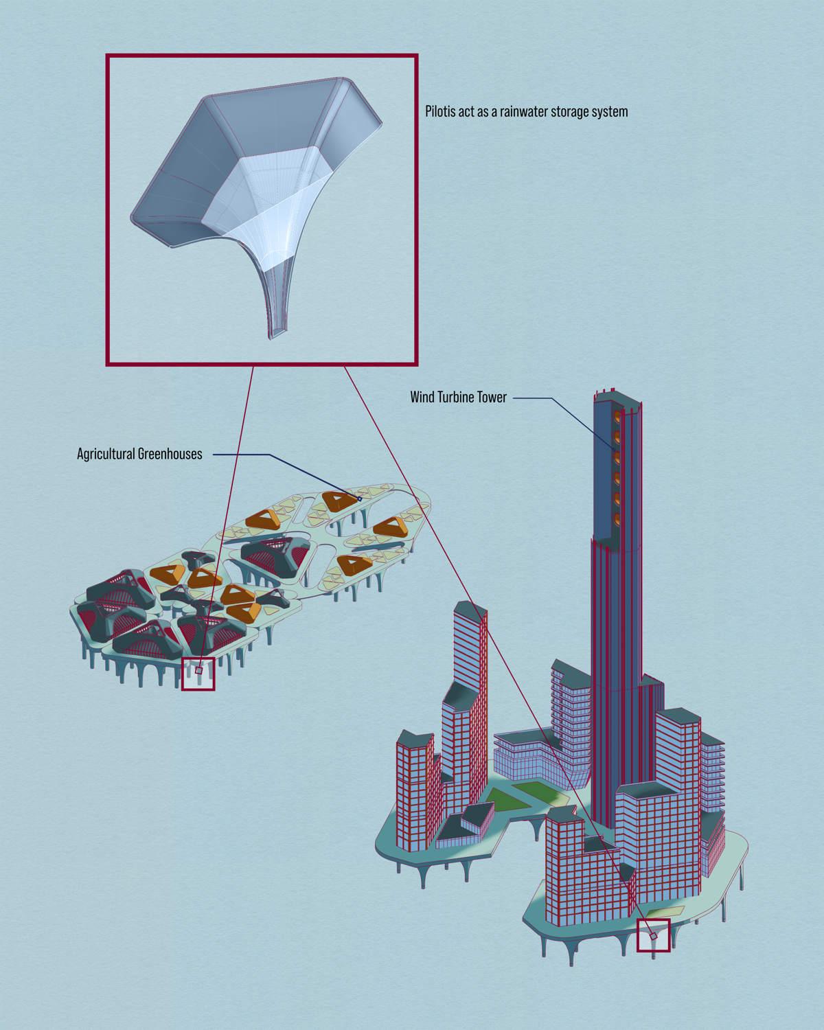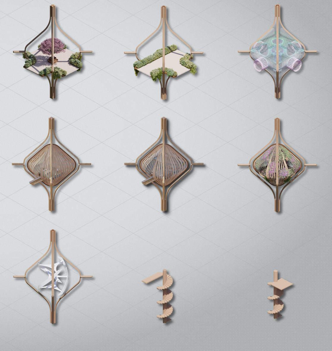 A series of components was created, each able to connect with the other to create a flowing urban fabric raised on stilts and be nestled in a sort of artificial canopy.