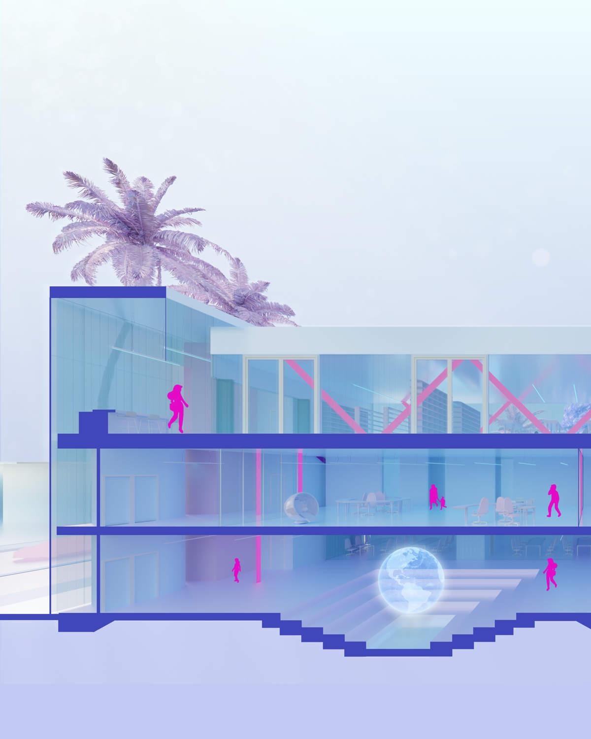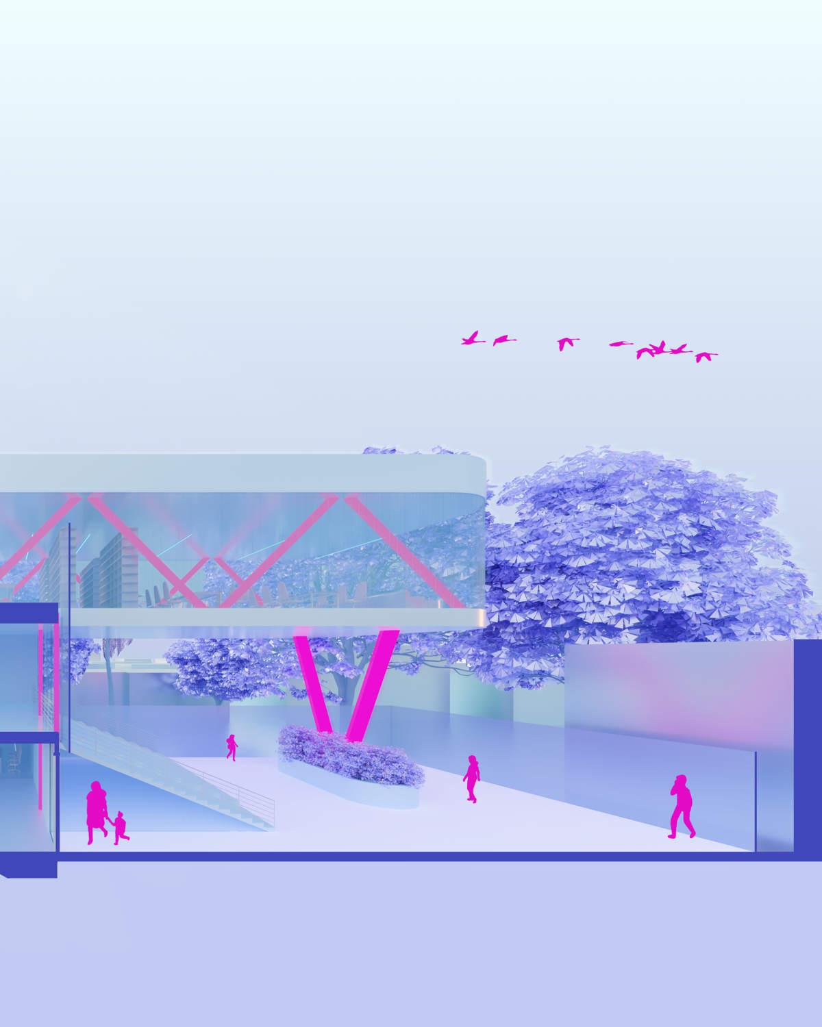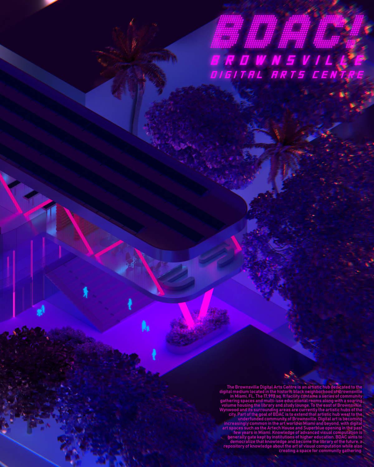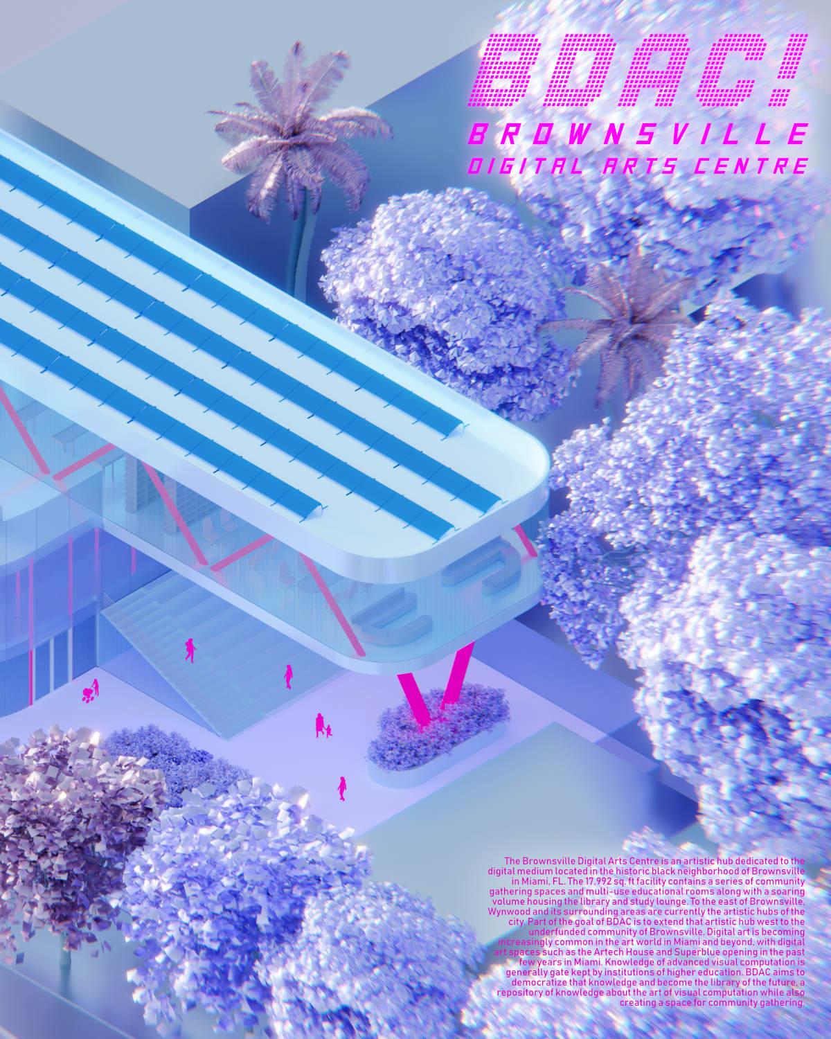 The Brownsville Digital Arts Centre is an artistic hub dedicated to the digital medium located in the historic black neighborhood of Brownsville in Miami, FL. The 17,992 sq. ft facility contains a series of community gathering spaces and multi-use educational rooms along with a soaring volume housing the library and study lounge. To the east of Brownsville, Wynwood and its surrounding areas are currently the artistic hubs of the city. Part of the goal of BDAC is to extend that artistic hub west to the underfunded community of Brownsville. Digital art is becoming increasingly common in the art world in Miami and beyond, with digital art spaces such as the Artech House and Superblue opening in the past few years in Miami. Knowledge of advanced visual computation is generally gate kept by institutions of higher education. BDAC aims to democratize that knowledge and become the library of the future, a repository of knowledge about the art of visual computation while also creating a space for community gathering.