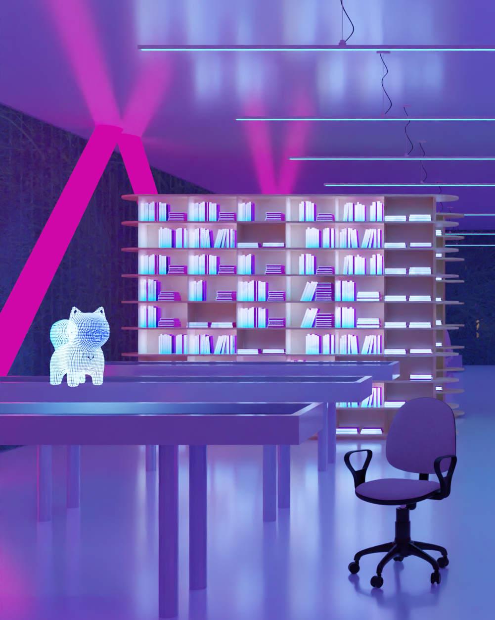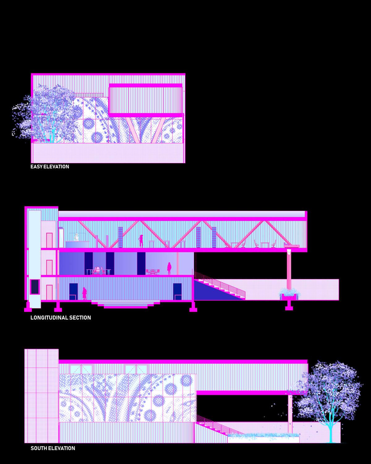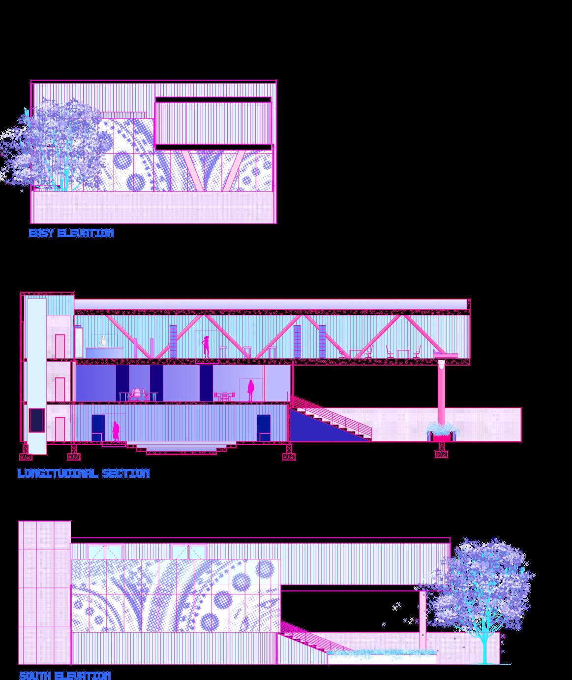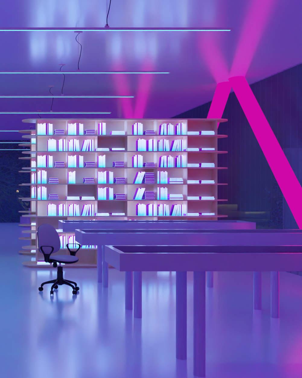 The Brownsville Digital Arts Centre is an artistic hub dedicated to the digital medium located in the historic black neighborhood of Brownsville in Miami, FL. The 17,992 sq. ft facility contains a series of community gathering spaces and multi-use educational rooms along with a soaring volume housing the library and study lounge. To the east of Brownsville, Wynwood and its surrounding areas are currently the artistic hubs of the city. Part of the goal of BDAC is to extend that artistic hub west to the underfunded community of Brownsville. Digital art is becoming increasingly common in the art world in Miami and beyond, with digital art spaces such as the Artech House and Superblue opening in the past few years in Miami. Knowledge of advanced visual computation is generally gate kept by institutions of higher education. BDAC aims to democratize that knowledge and become the library of the future, a repository of knowledge about the art of visual computation while also creating a space for community gathering.
