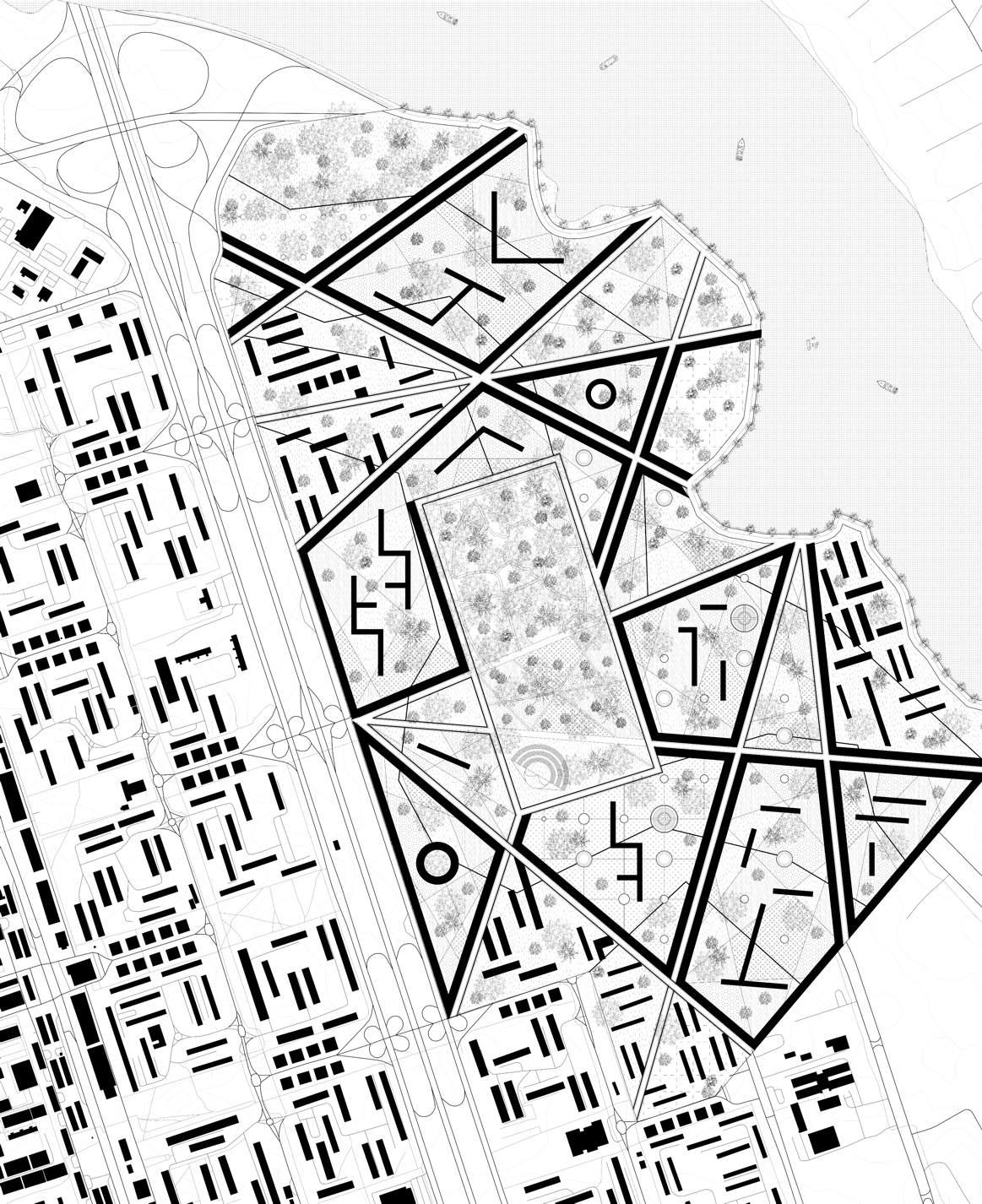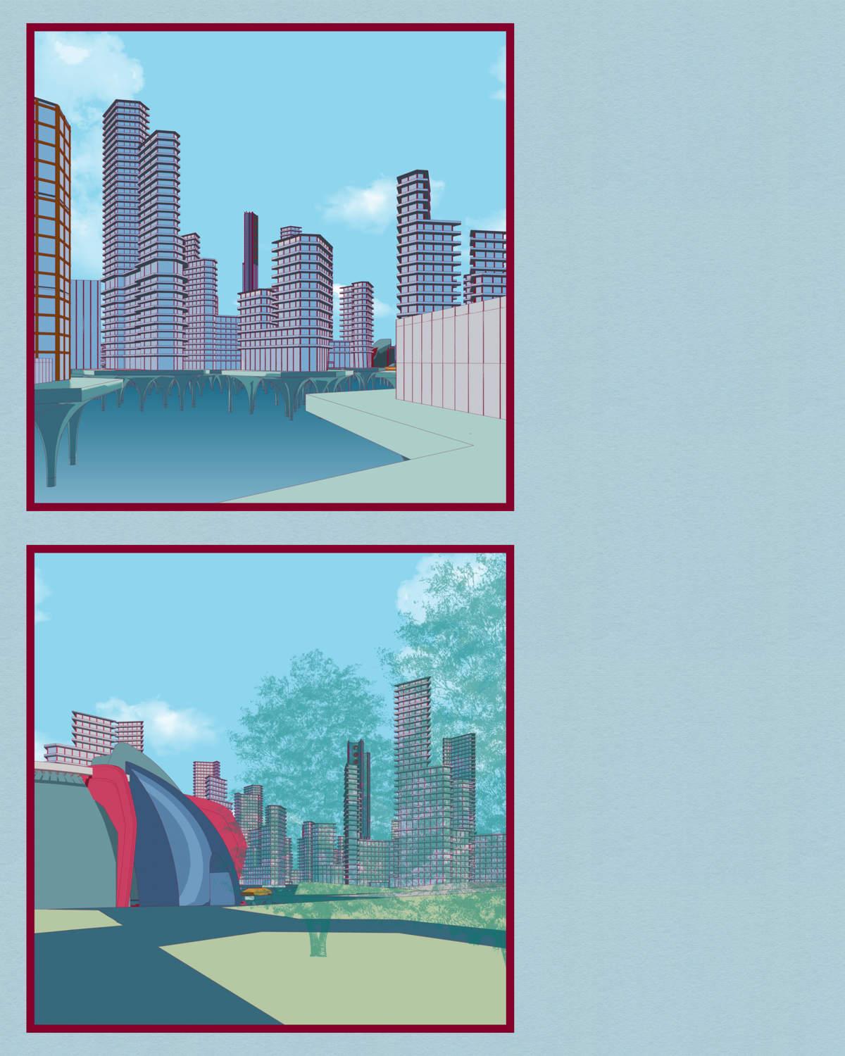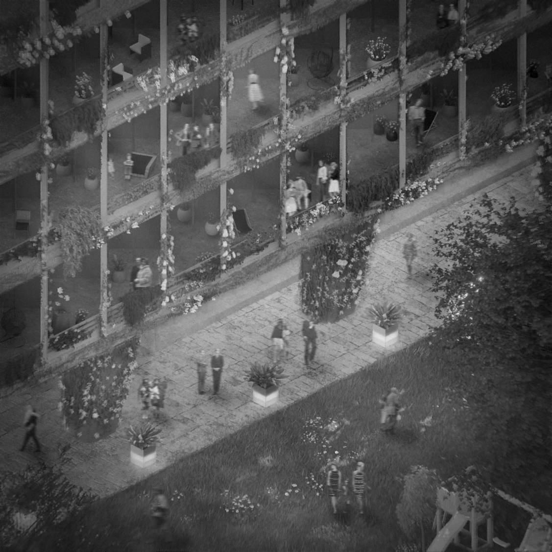 The resultant space would be lively and highly pedestrian, with green spaces for the residents to enjoy as well as having work and retail spaces in the commercial object buildings inside each compartment.