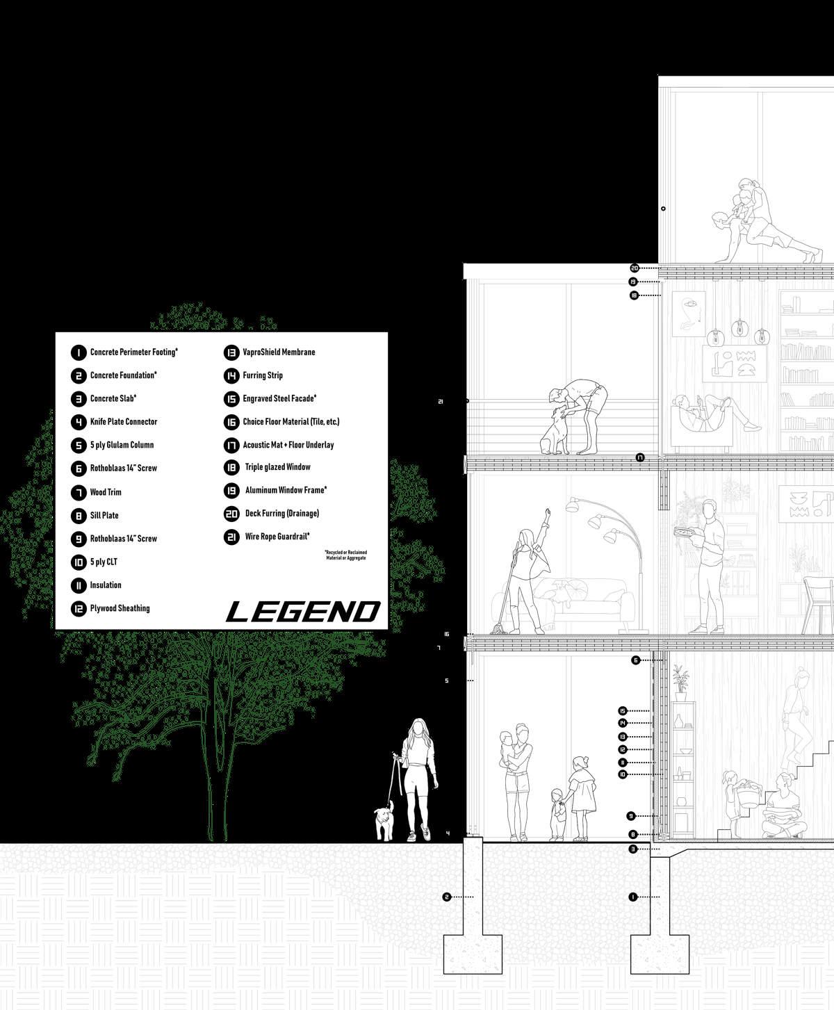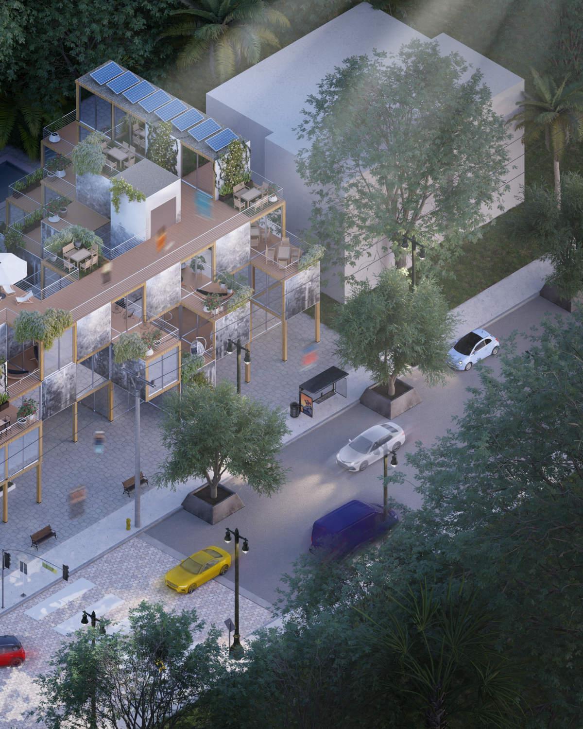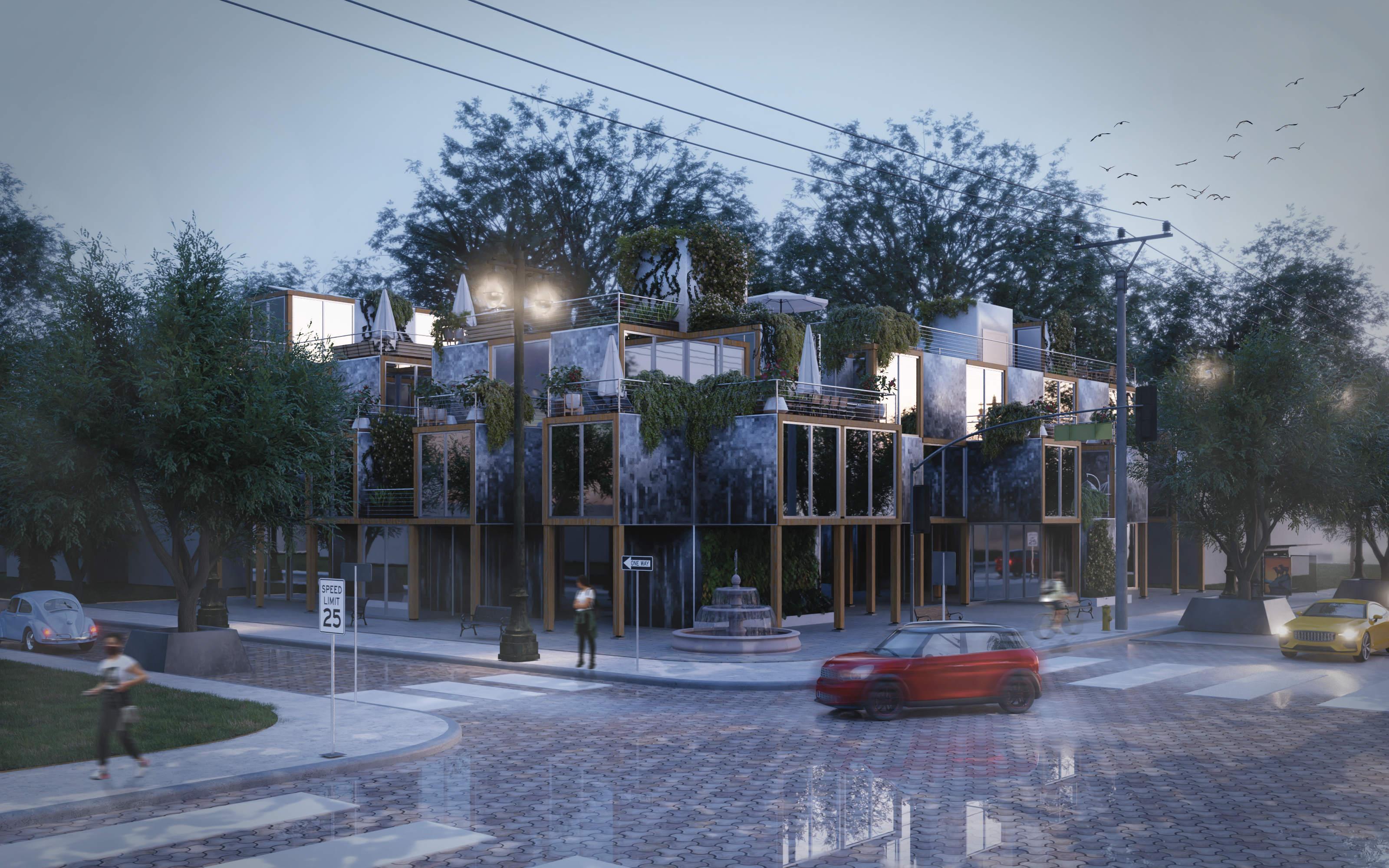 Voxel in the Grove proposes a multi-family affordable housing complex in West Coconut Grove built entirely of a hybrid Southern Yellow Pine, 5ply CLT and Glulam column structure. A voxelized mass would surround a communal courtyard, with small terraces connected by metal catwalks on upper levels, creating an exterior circulation to access most of the units. The 16 differently shaped units give a range of options, providing a village like space nestled into the forest-like structure, creating a diverse community in the complex, one which promoted diverse interactions between its inhabitants