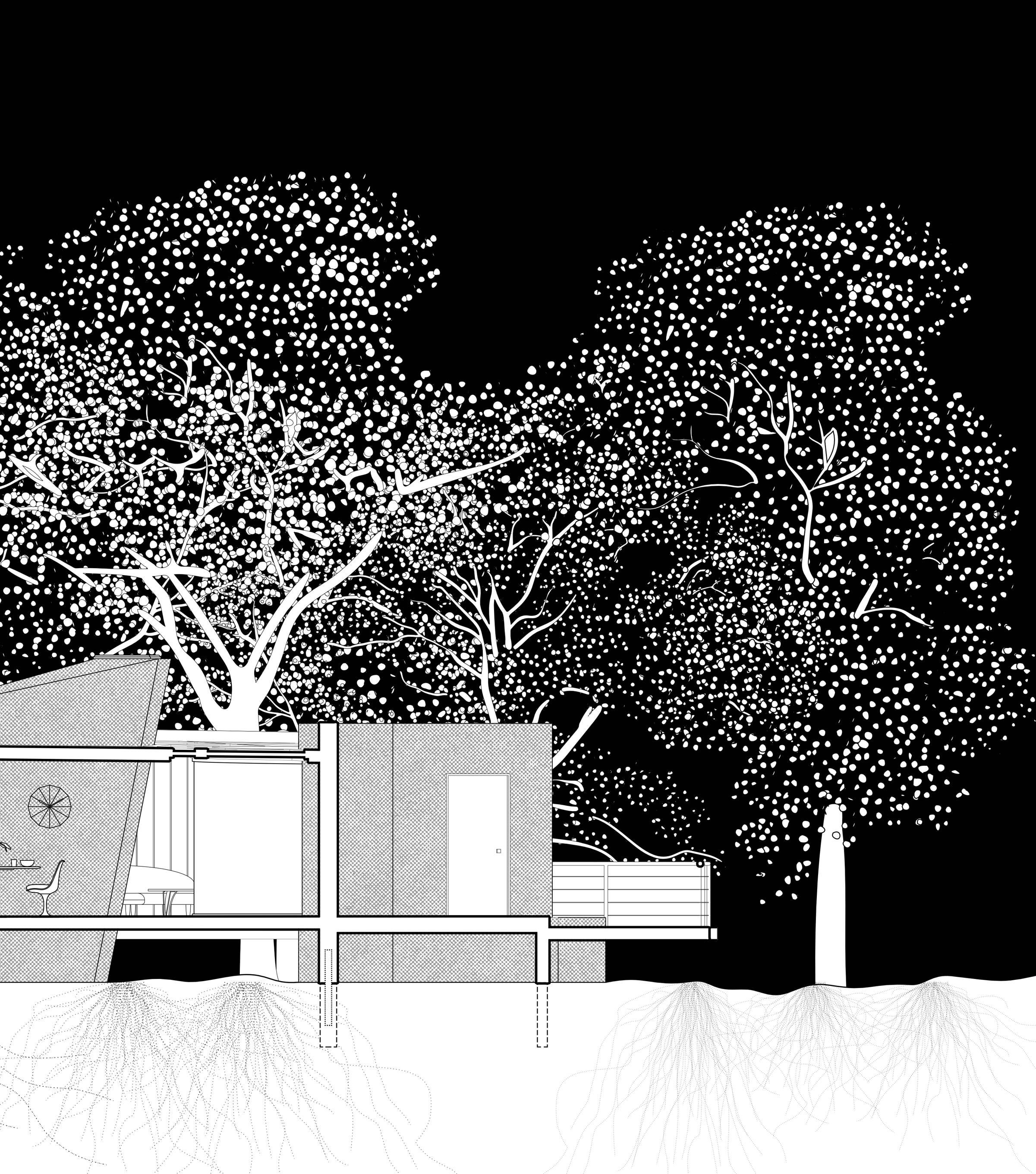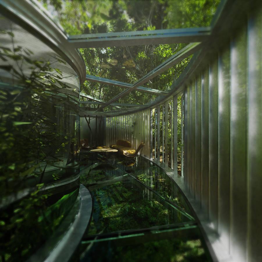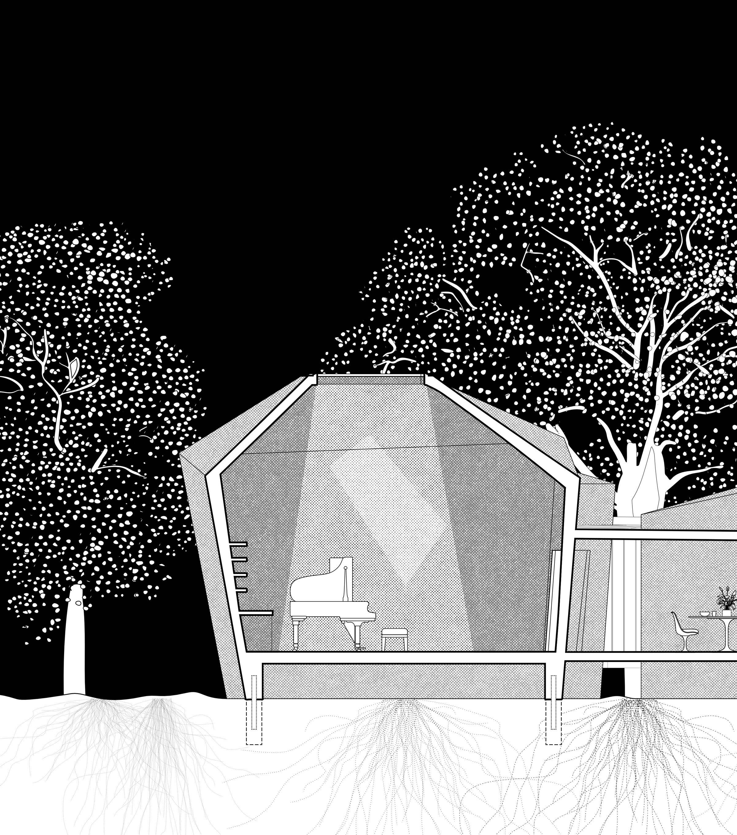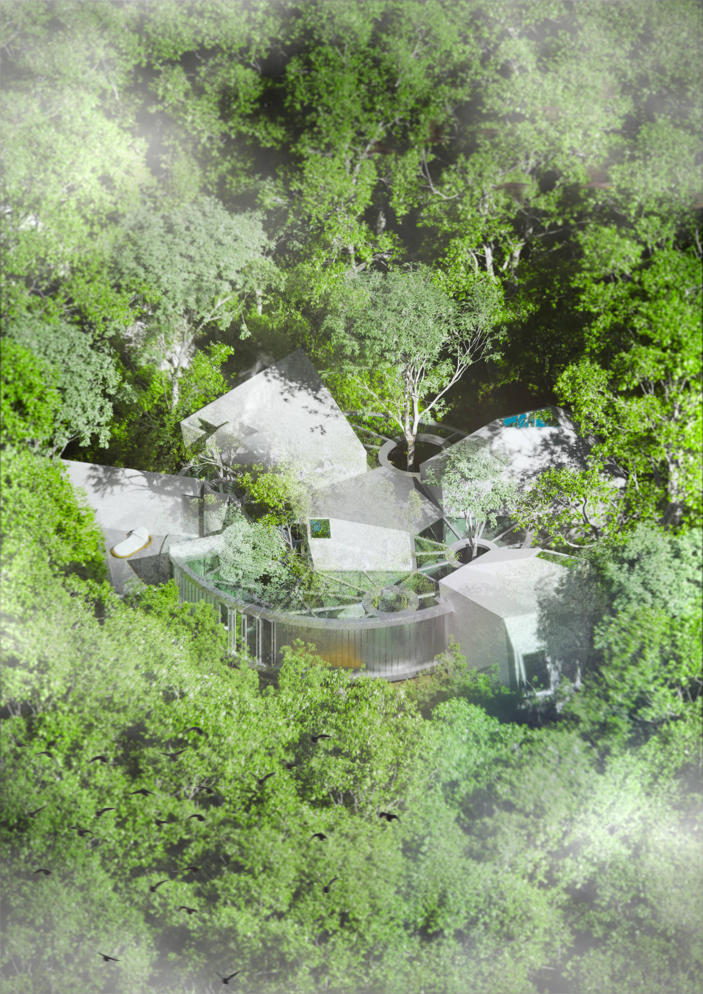 CODA Imagines a house for the Japanese composer Ryuichi Sakamoto, nestled within Simpson Park in Miami, a dense native hammock isolated within the overall landscape of the city’s urban center. The design takes its cues from the Japanese term “komoerebi” which refers to the dappled light that filters through tree canopies. From this, the concept of solids and voids were developed to create concrete “crystals” to hold the more rigid programs of a house, while two circular slabs primarily consisting of glass would embed the more public programs within the natural context.