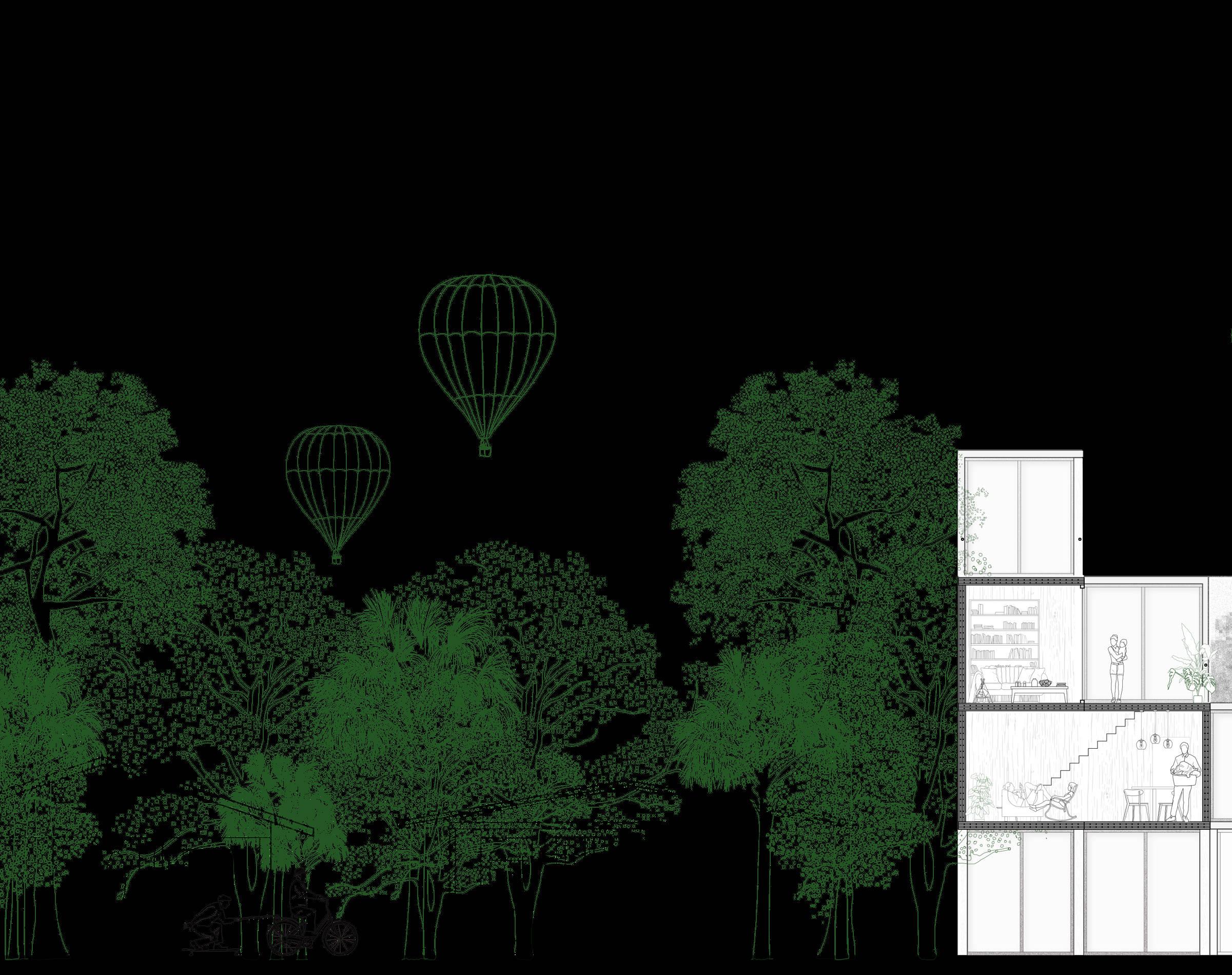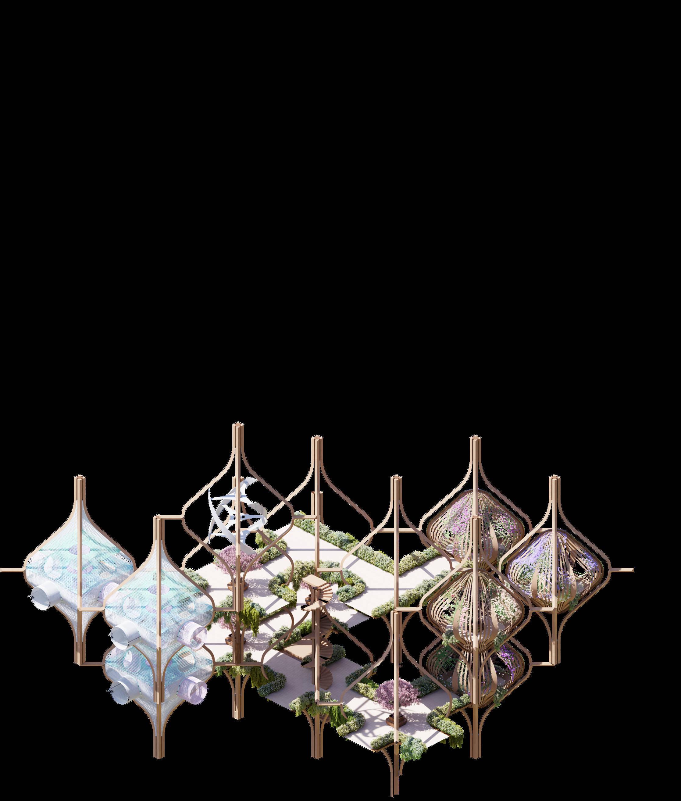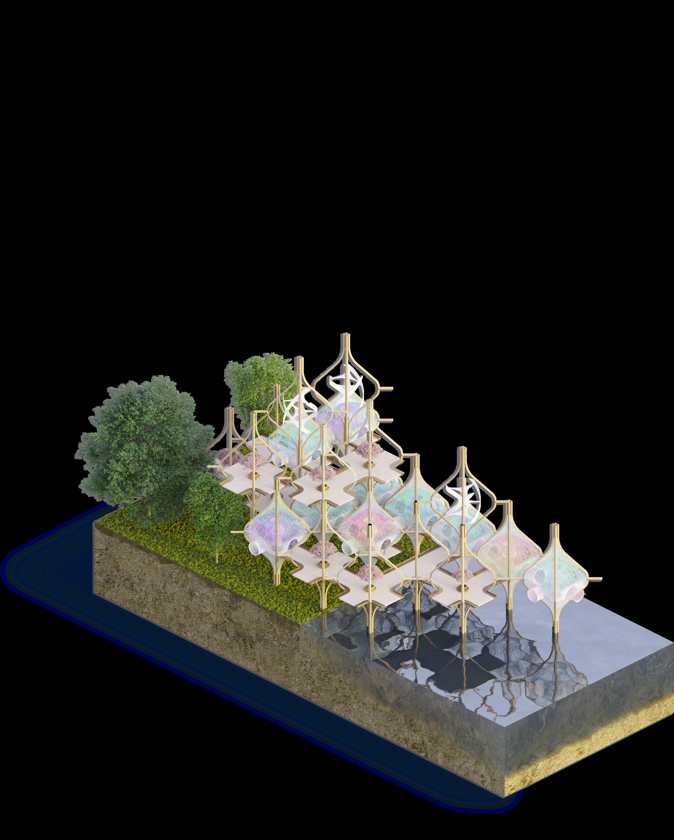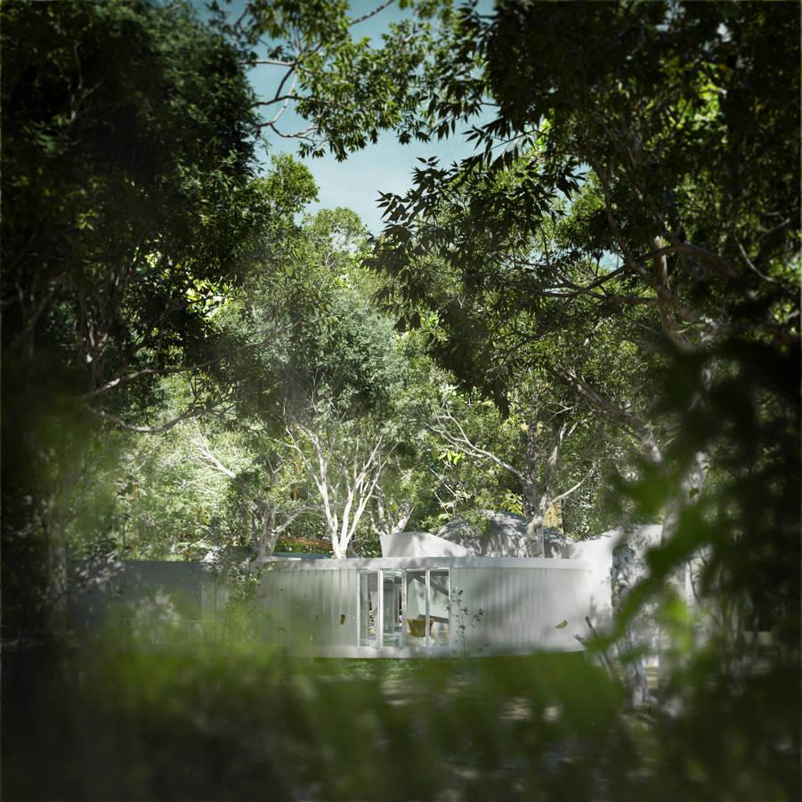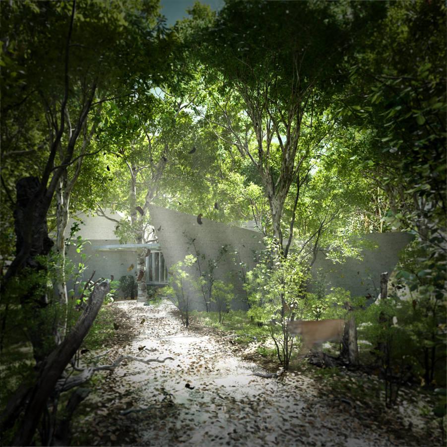 CODA Imagines a house for the Japanese composer Ryuichi Sakamoto, nestled within Simpson Park in Miami, a dense native hammock isolated within the overall landscape of the city’s urban center. The design takes its cues from the Japanese term “komoerebi” which refers to the dappled light that filters through tree canopies. From this, the concept of solids and voids were developed to create concrete “crystals” to hold the more rigid programs of a house, while two circular slabs primarily consisting of glass would embed the more public programs within the natural context.
