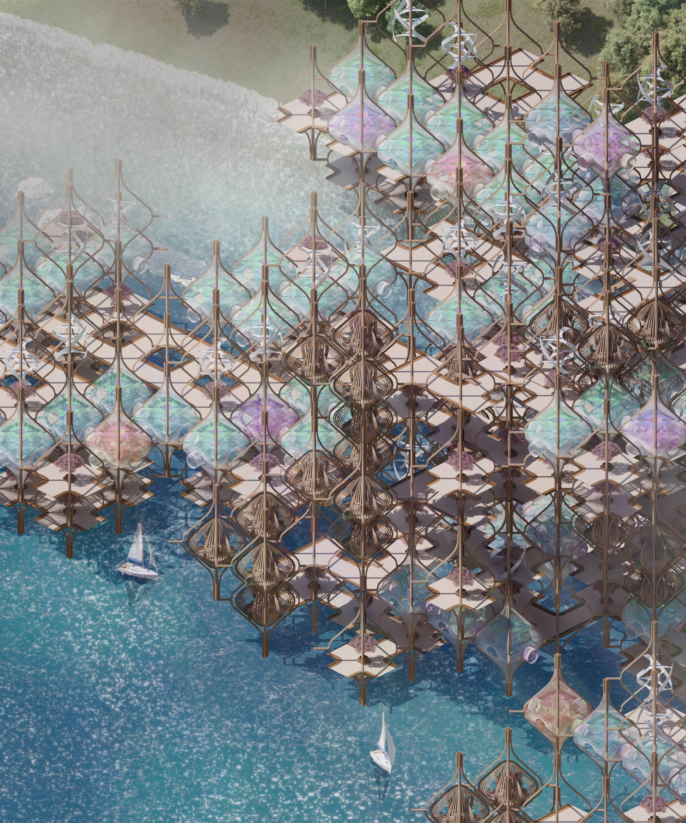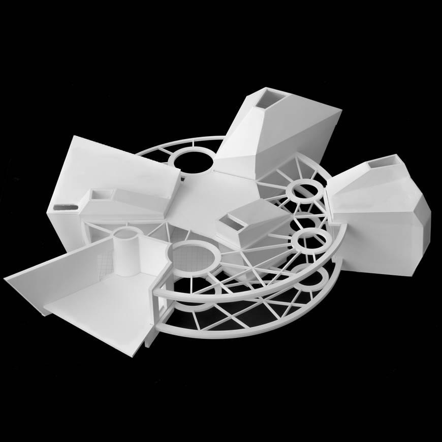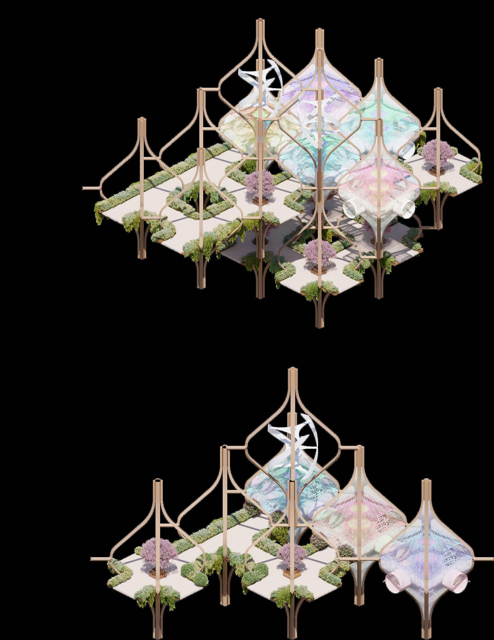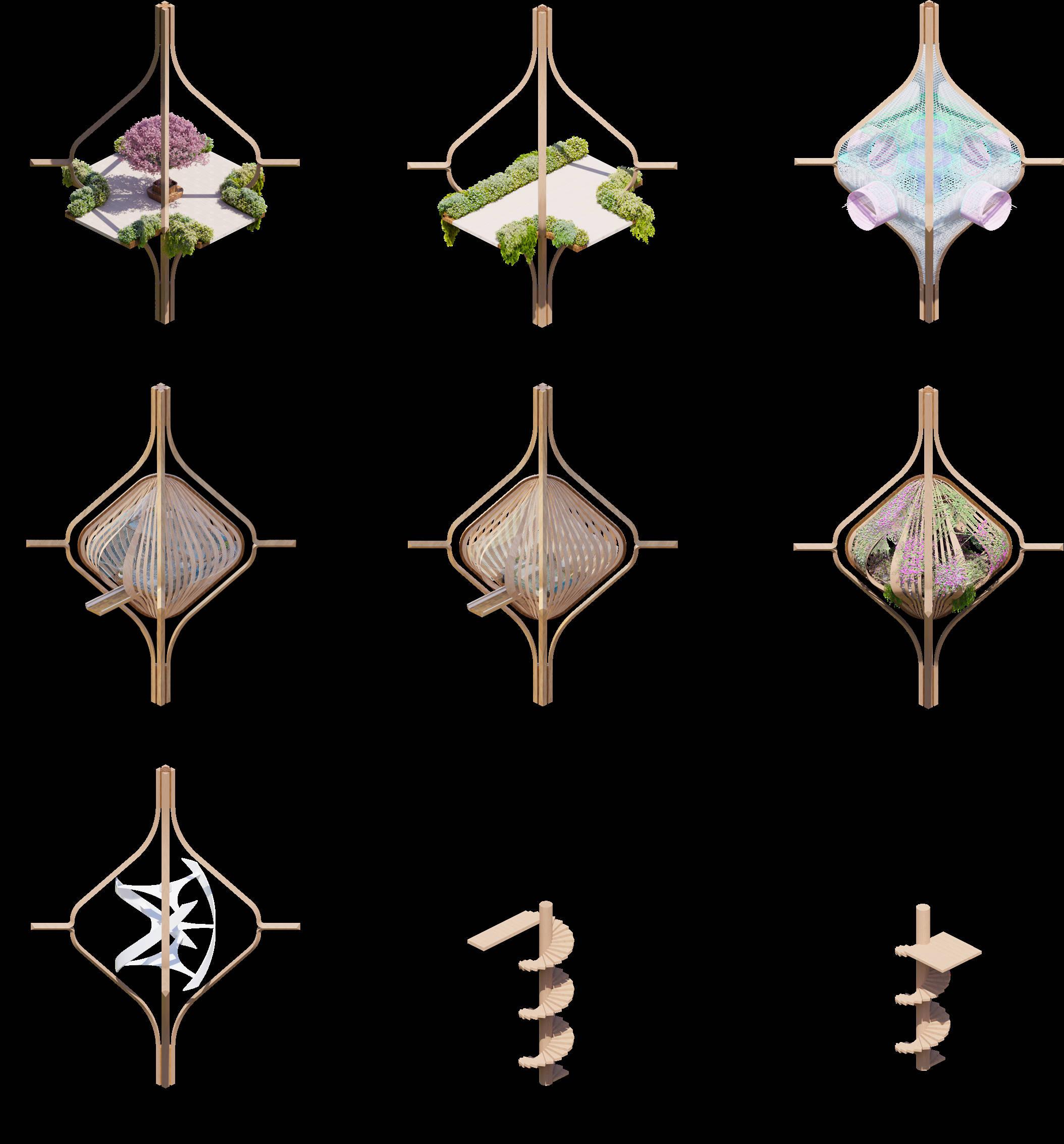 CODA Imagines a house for the Japanese composer Ryuichi Sakamoto, nestled within Simpson Park in Miami, a dense native hammock isolated within the overall landscape of the city’s urban center. The design takes its cues from the Japanese term “komoerebi” which refers to the dappled light that filters through tree canopies. From this, the concept of solids and voids were developed to create concrete “crystals” to hold the more rigid programs of a house, while two circular slabs primarily consisting of glass would embed the more public programs within the natural context.