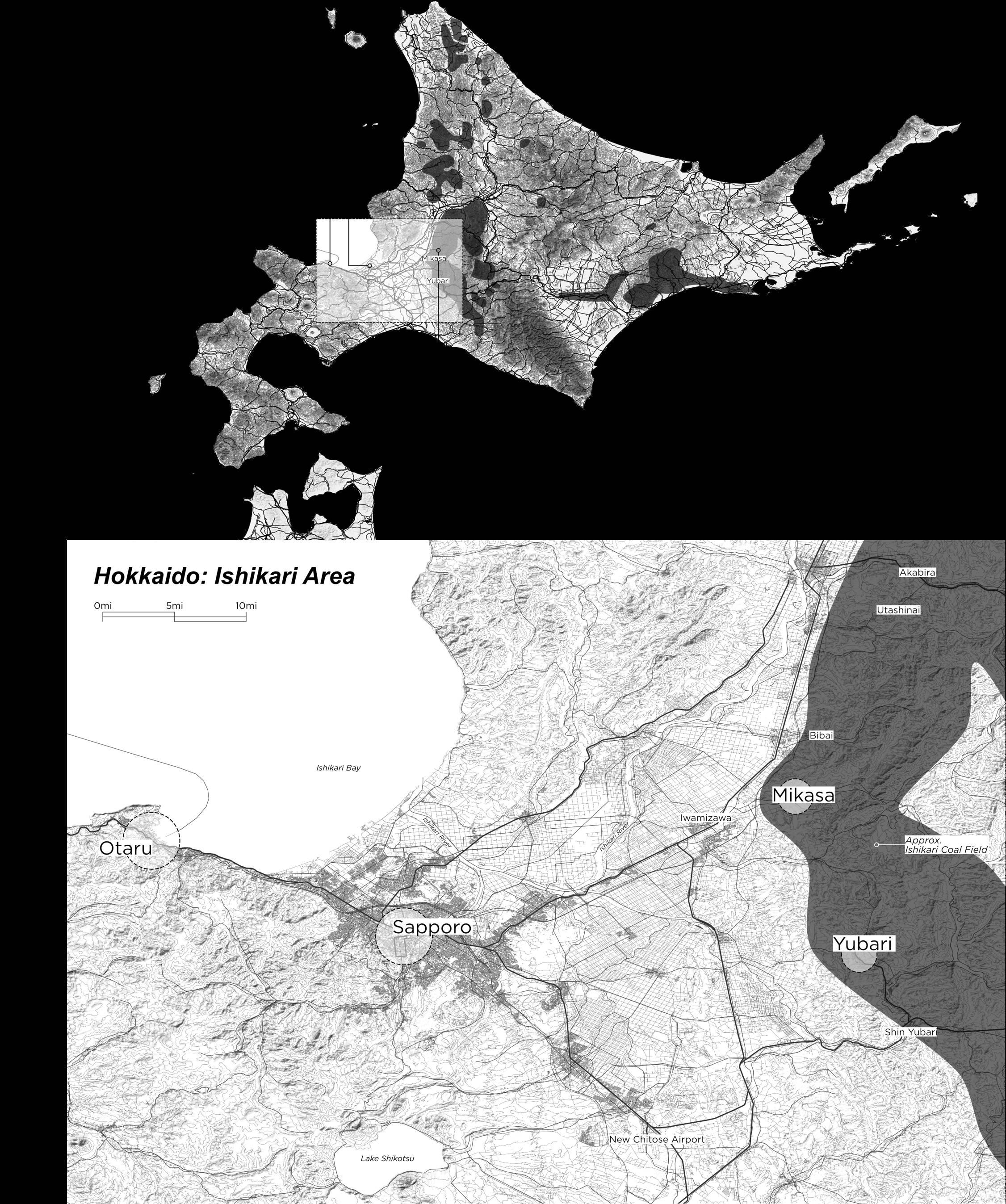 The three sites were selected to represent different extractive histories, geographies, and industrial trajectories within Japan. The Seto Inland Sea’s Art Islands illustrate a curated and distinct model of regeneration, where former copper and industrial sites, once mired in scandals regarding illegal industrial waste, have been reactivated through art, architecture, and sustained private investment. Hokkaido’s Ishikari Coal Basin was chosen for its scale and placement within Hokkaido’s broader history: central towards Japan’s rapid industrialisation during the Meiji era, it now presents a landscape of abandoned mines and declining towns shaped by economic shifts and rural depopulation. Sado Island’s gold mines offer an older example where centuries of extraction have been absorbed into a consolidated narrative, recently recognised by UNESCO as a World Heritage Site, yet also holding controversial histories of conscripted labour. Together, these sites attempt to provide a holistic reading of how interplaying variables can influence the afterlives of such landscapes and who’s architectural regeneration can perhaps provide solutions to the twin issues of rural depopulation and urban over-crowding.