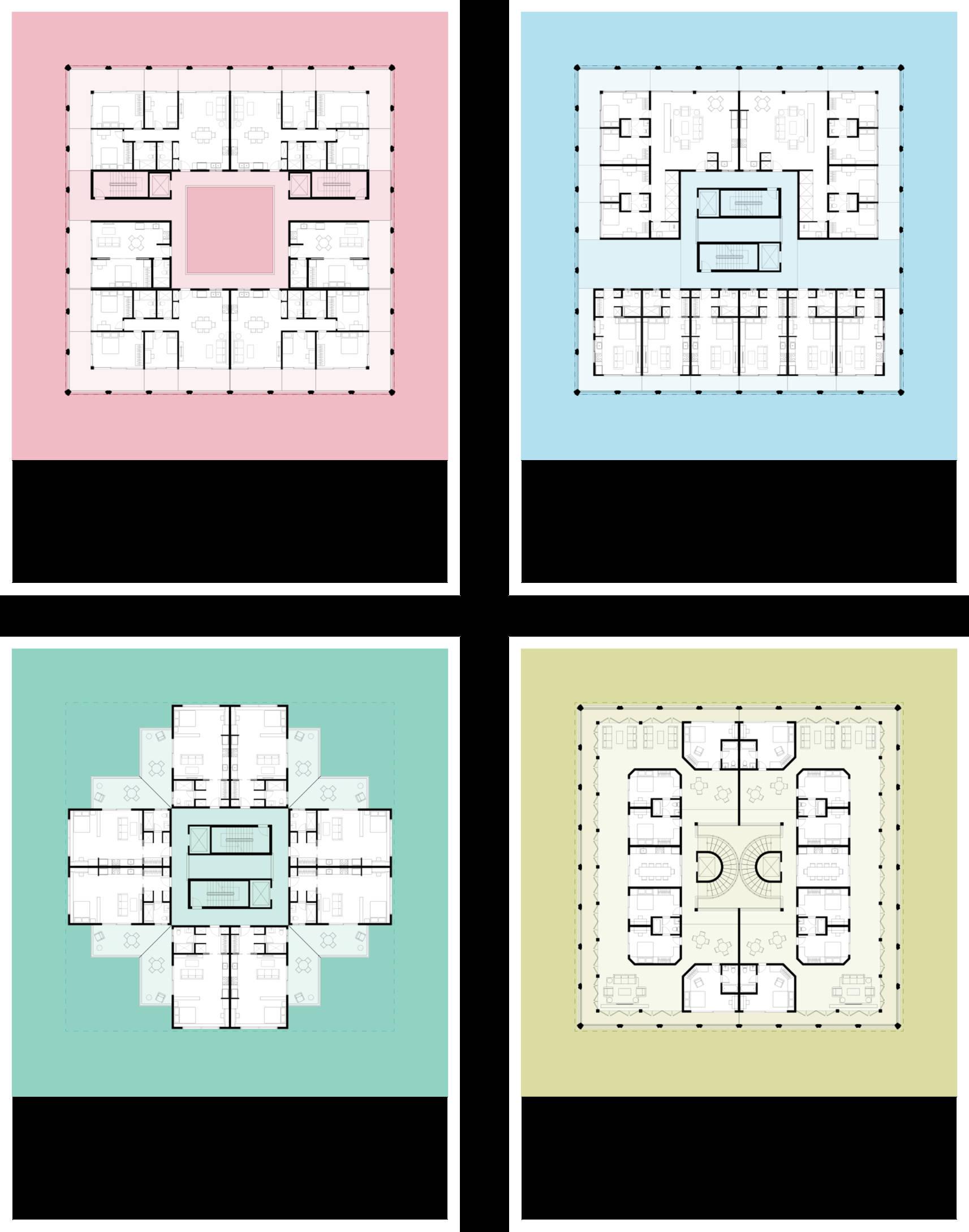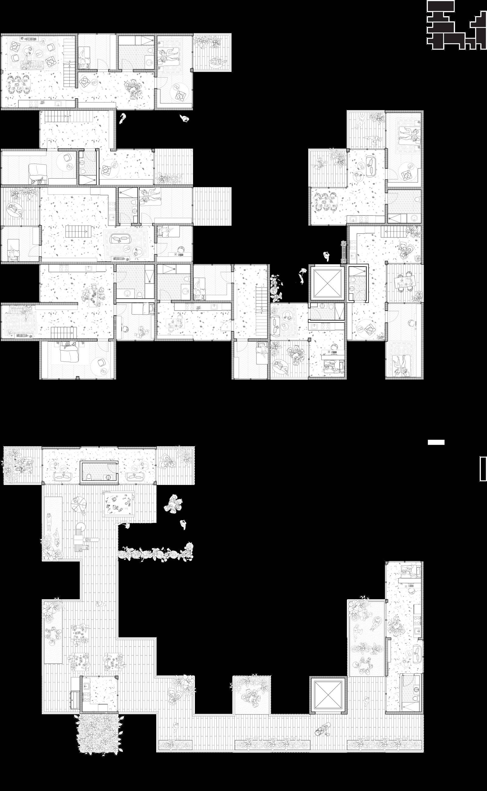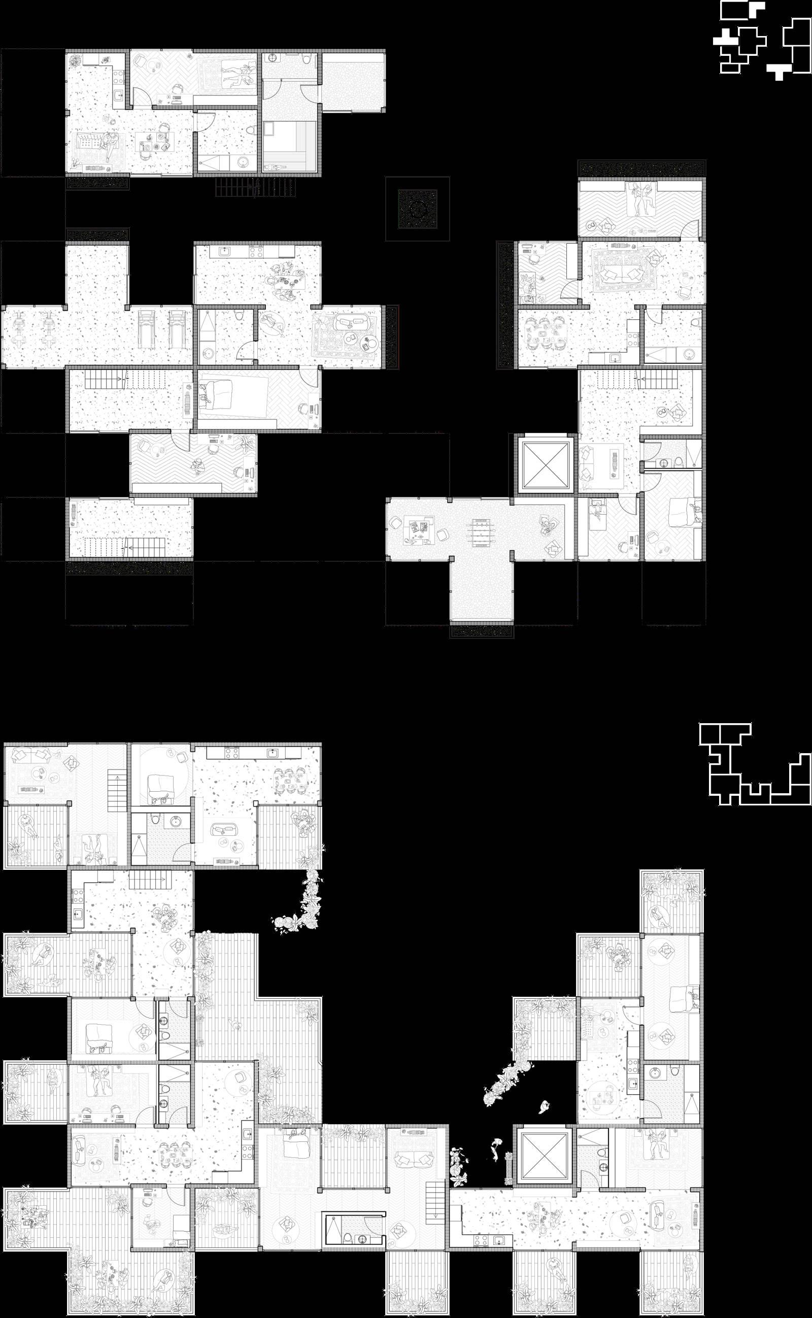 [Left] 67 unique floor plans ranging from Hotel-room, dorm, studio, 1-bed, 2bed, 3-bed, non-square, and penthouse types showcase the endless combinations possible within the frameworks of the 100’x100’ lot plan.