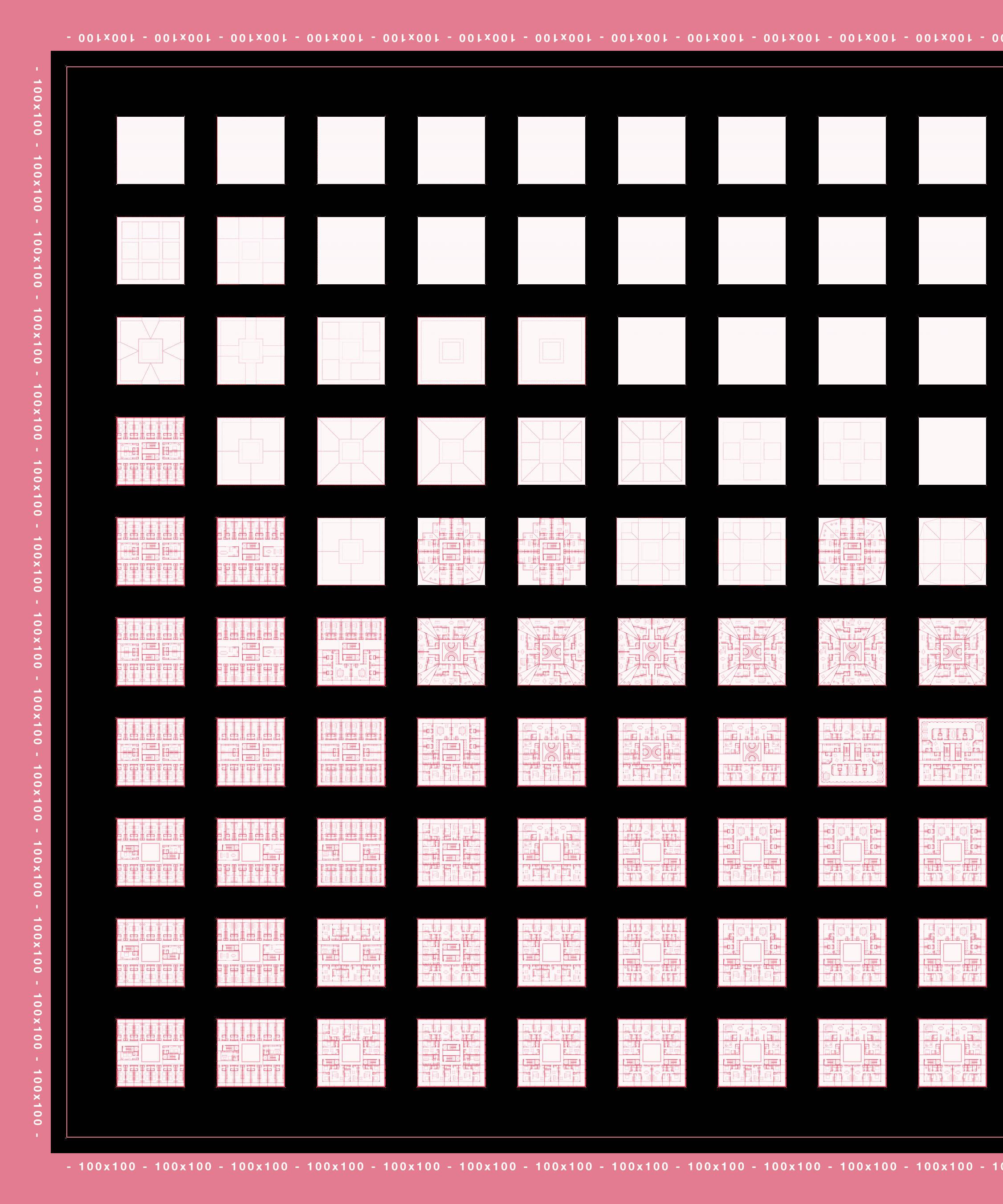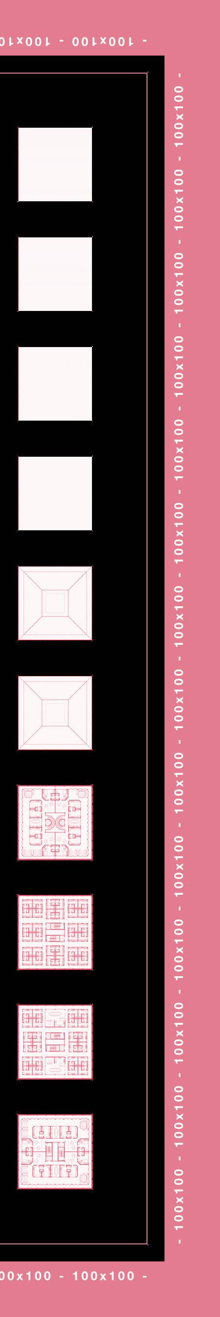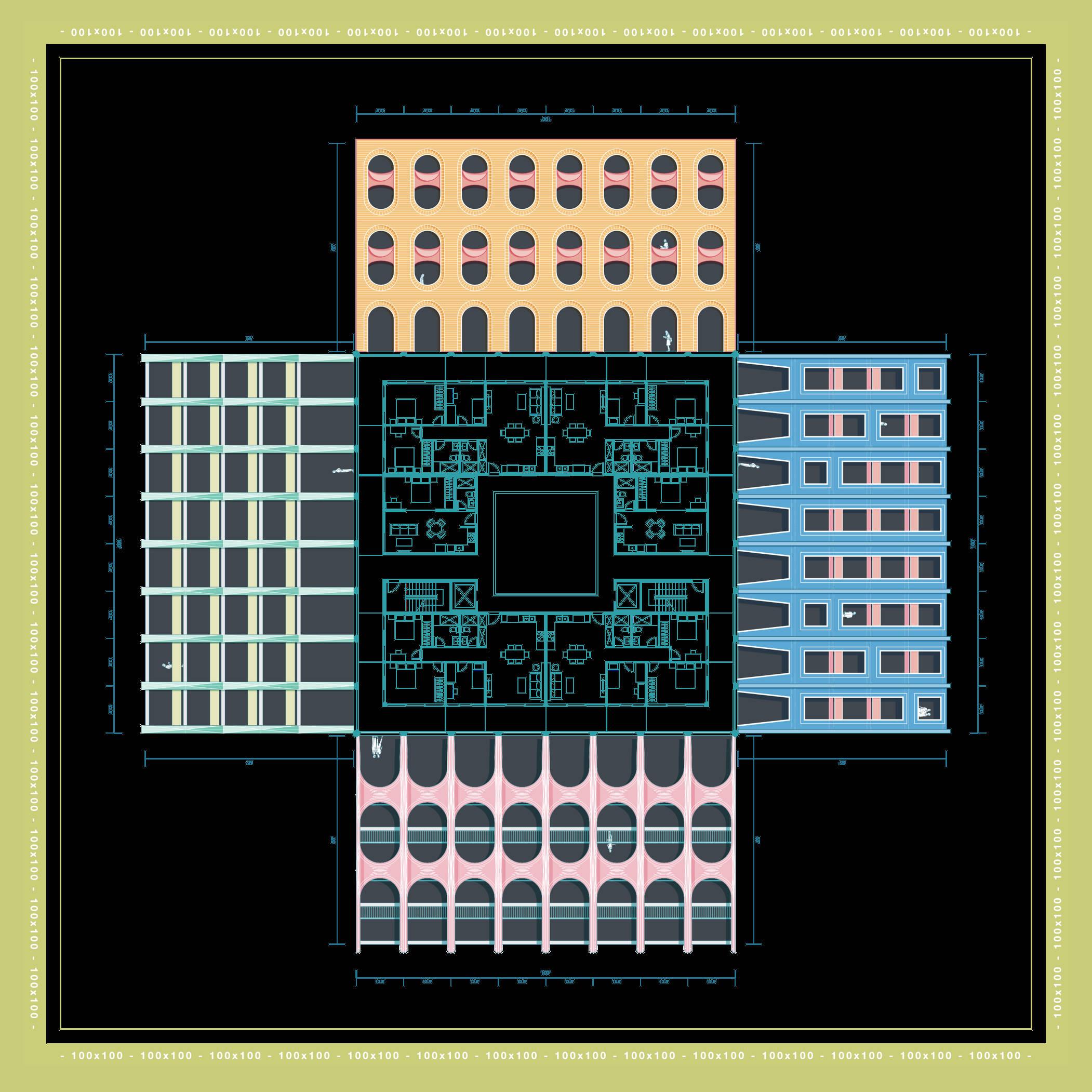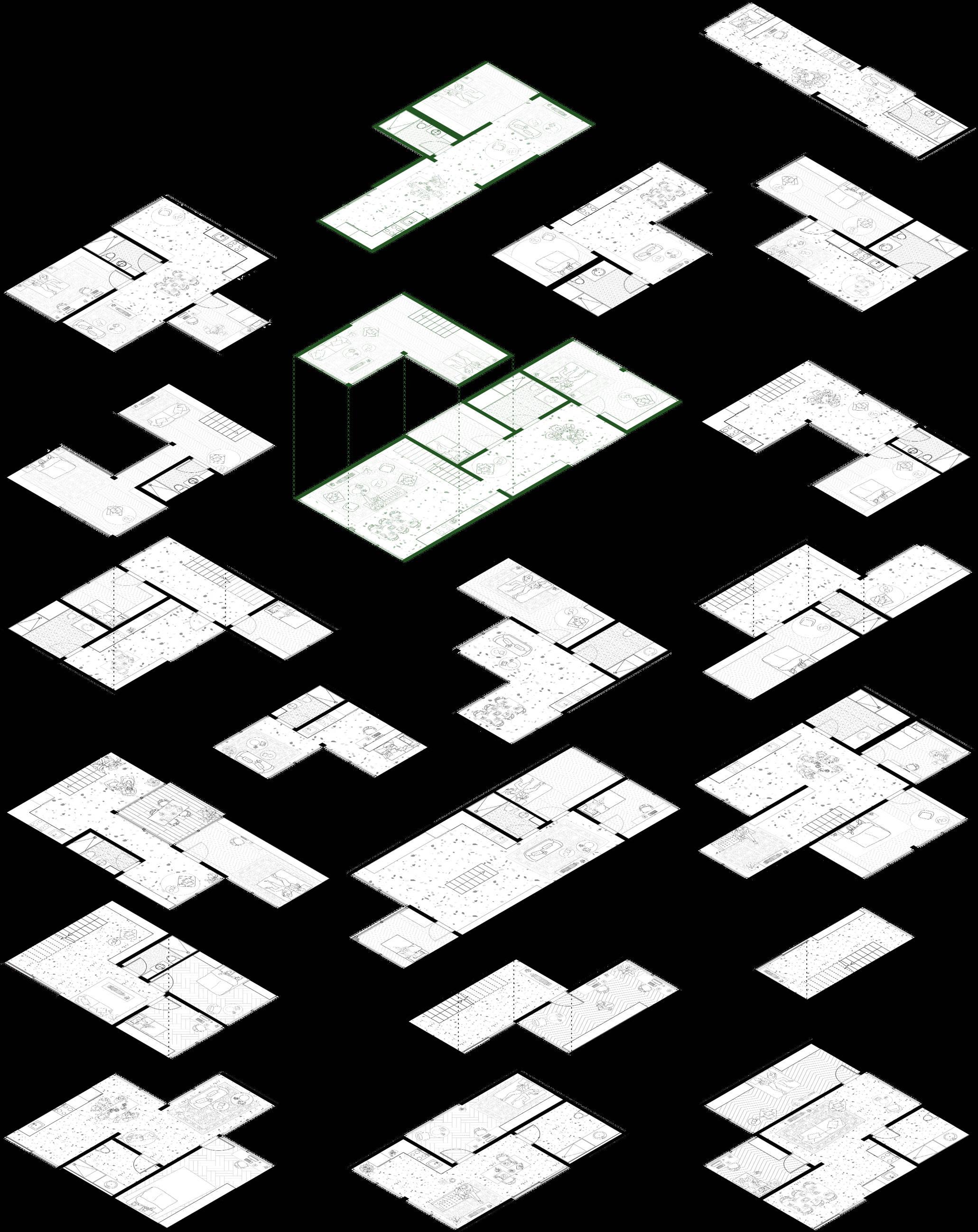 [Left] 67 unique floor plans ranging from Hotel-room, dorm, studio, 1-bed, 2bed, 3-bed, non-square, and penthouse types showcase the endless combinations possible within the frameworks of the 100’x100’ lot plan.