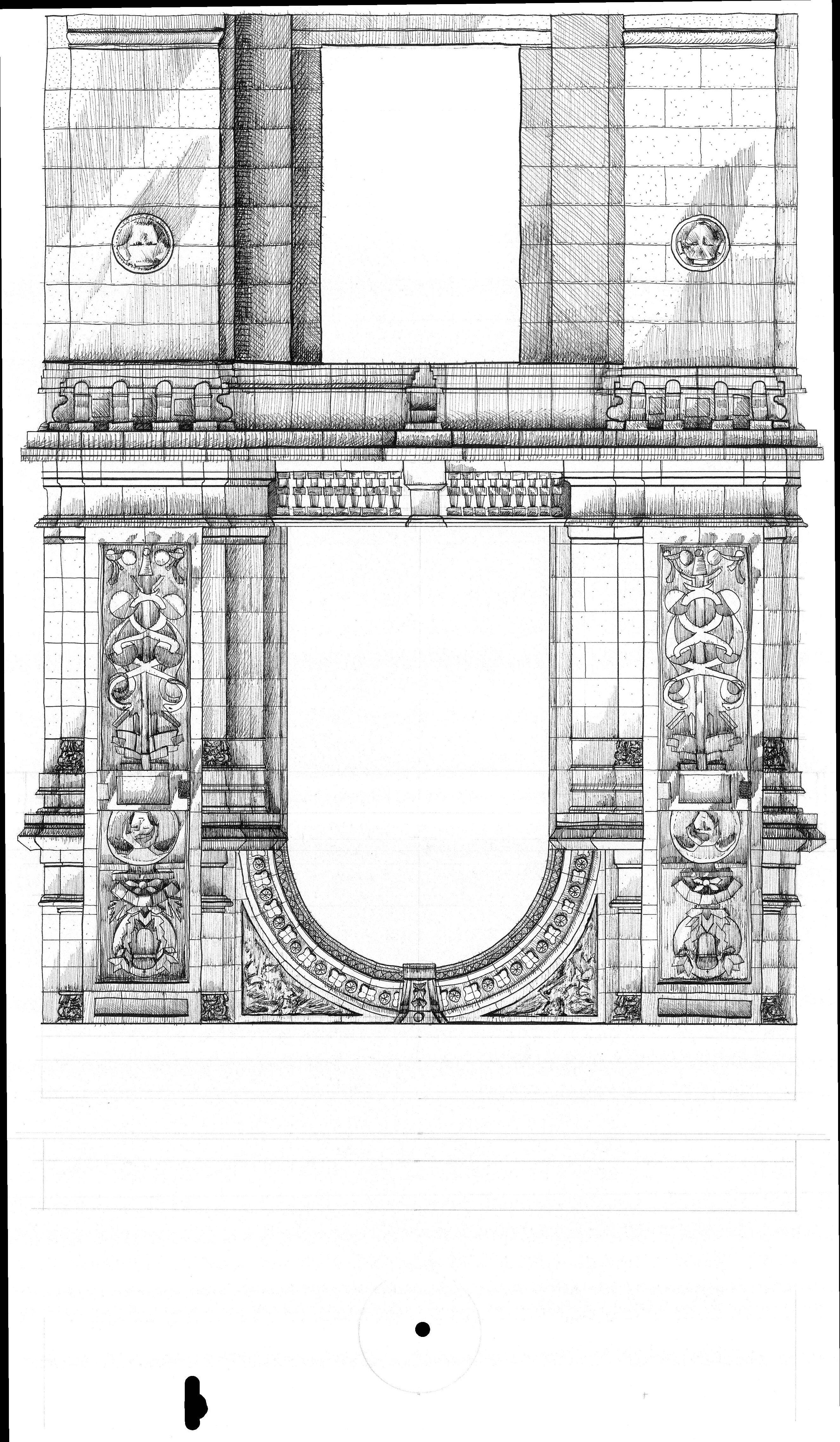 Surrounding is a study of light and shadow through detailed rendering of the modern marble facade of the extension of the Bank of Madrid by Rafael Moneo. Detailed to mimic the elements of the old facades but made modern through digital fabrication and sculpting.