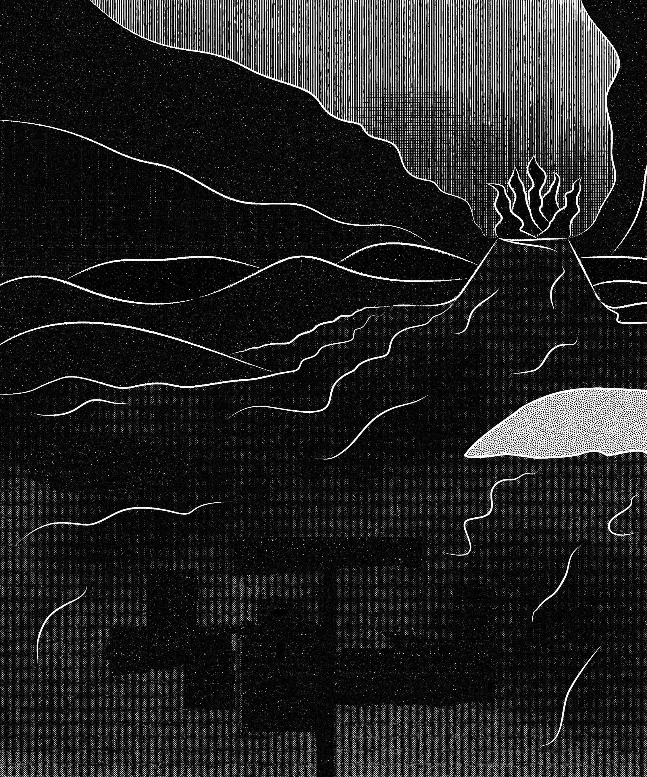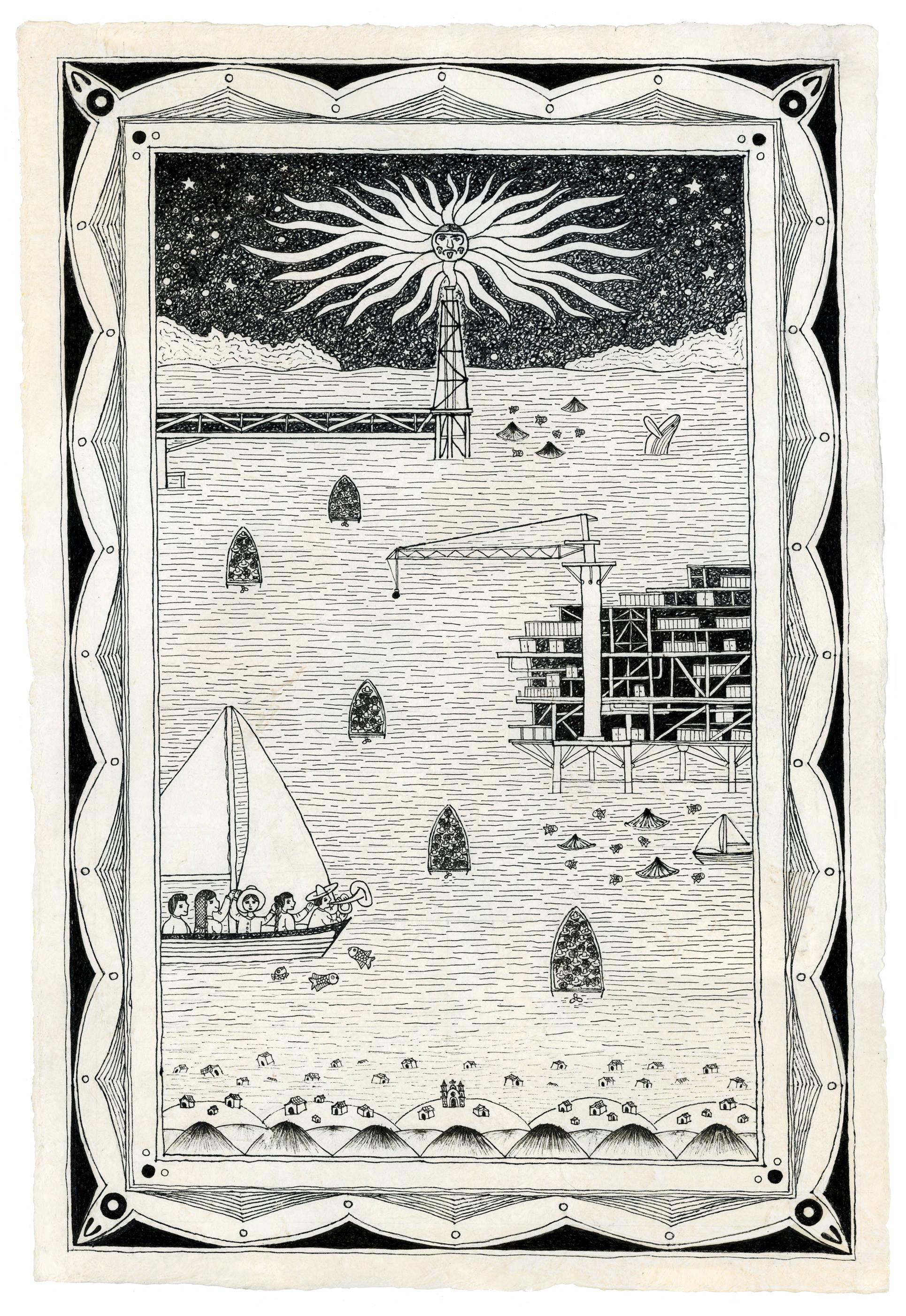 [Right] Created as a traditional Mexican amate painting using ink on amate bark paper, the drawing creates a narrative for the “foundation” of the idealised city of Cantarell in the Gulf of Mexico.