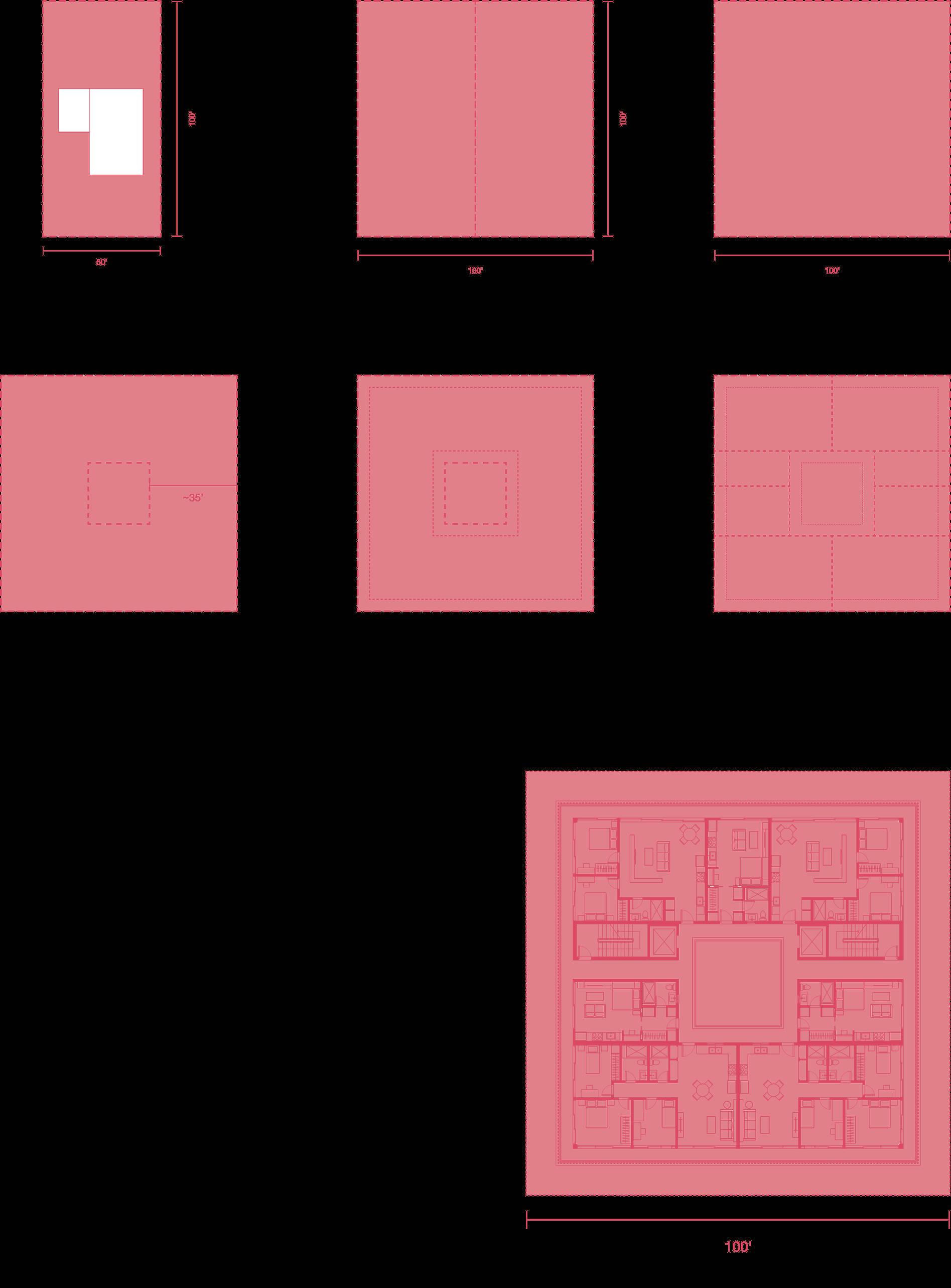 The palazzina was chosen for the project and a standard set of dimensioning and division was created for the original Miami block that would allow for easy modification of the already existing urban lot. The standard 50’x100’ block would be merged in sets of two, creating a new 100’x100’ double lot as base. From there setbacks and circulation corridors are defined, allowing for further division.