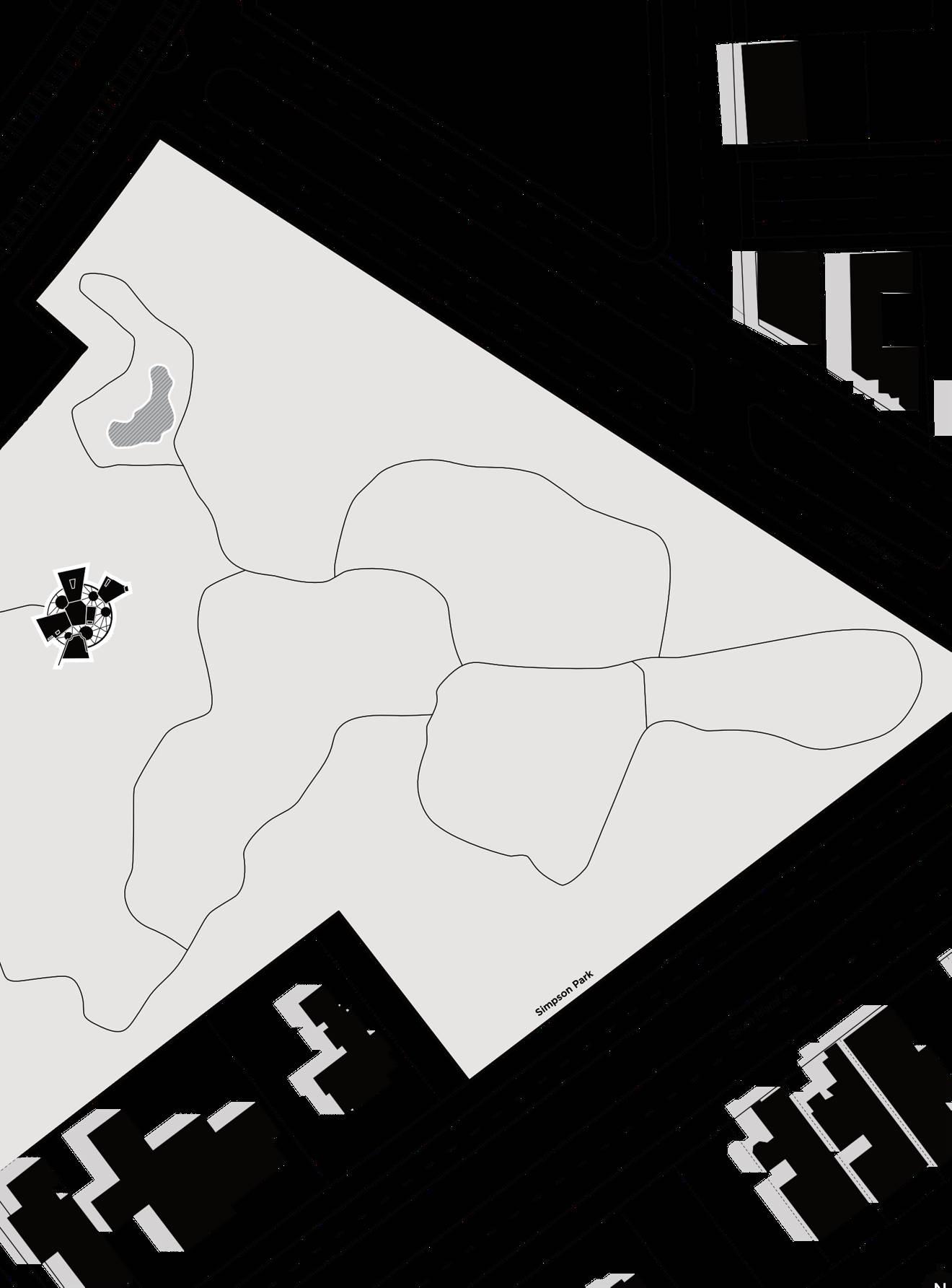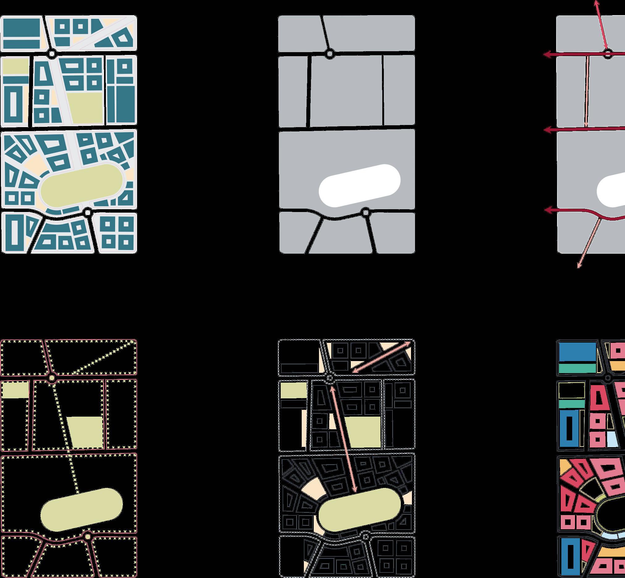 Using the typology of a palazzina block, the site was divided into vehicular and pedestrian paths, with the defunct dog track turned into a public park. The palazzina was further pushed and pulled, creating irregular shaped blocks that would mimic an organically grown street pattern while maintaining an approximate 100x100 lot dimension.