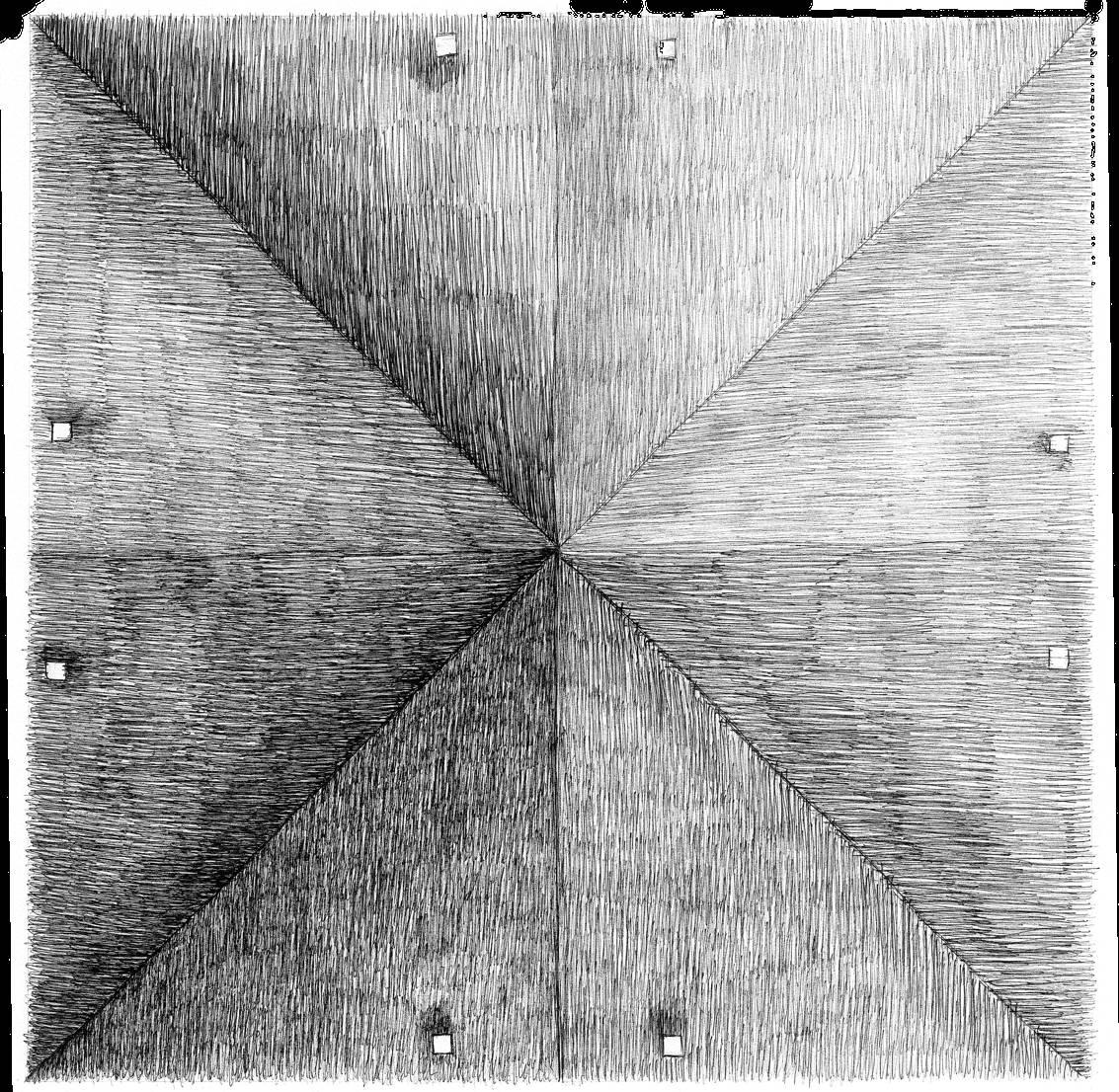 To the left another light and shadow study of a reflected ceiling of two of Louis Kahn’s buildings: the First Unitarian Church and the Dhaka National Assembly. Similar in the idea of plan, both featuring central assembly halls with side light-well lit spaces.