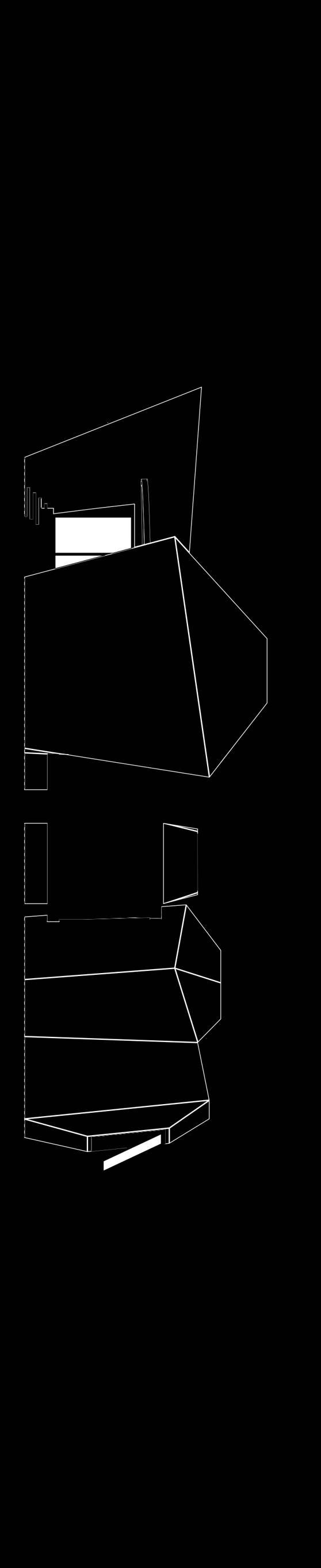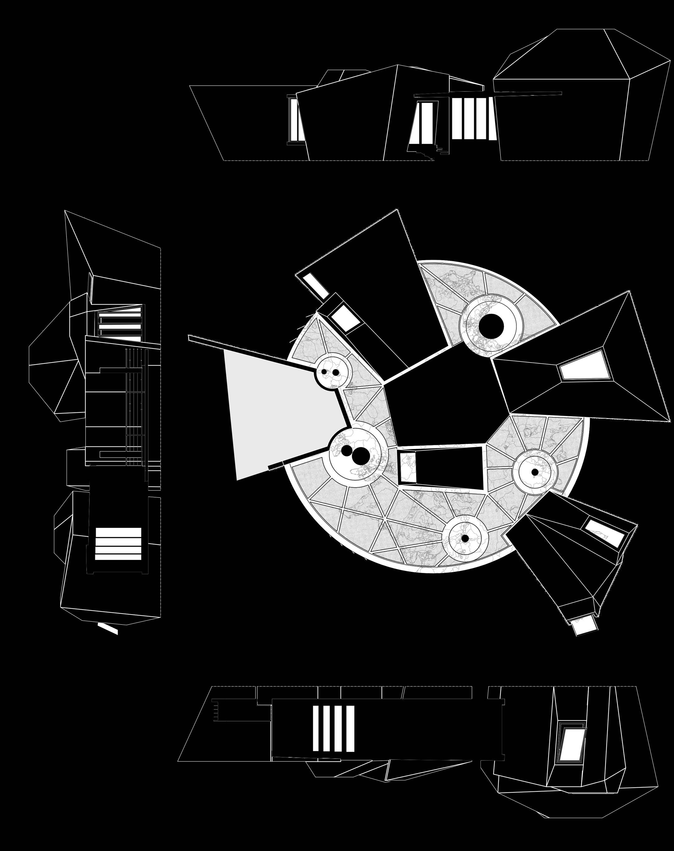 [Left] Roof plan of the house overlayed a 3D scan of the chosen location rotated to face North. Elevations of each cardinal direction.