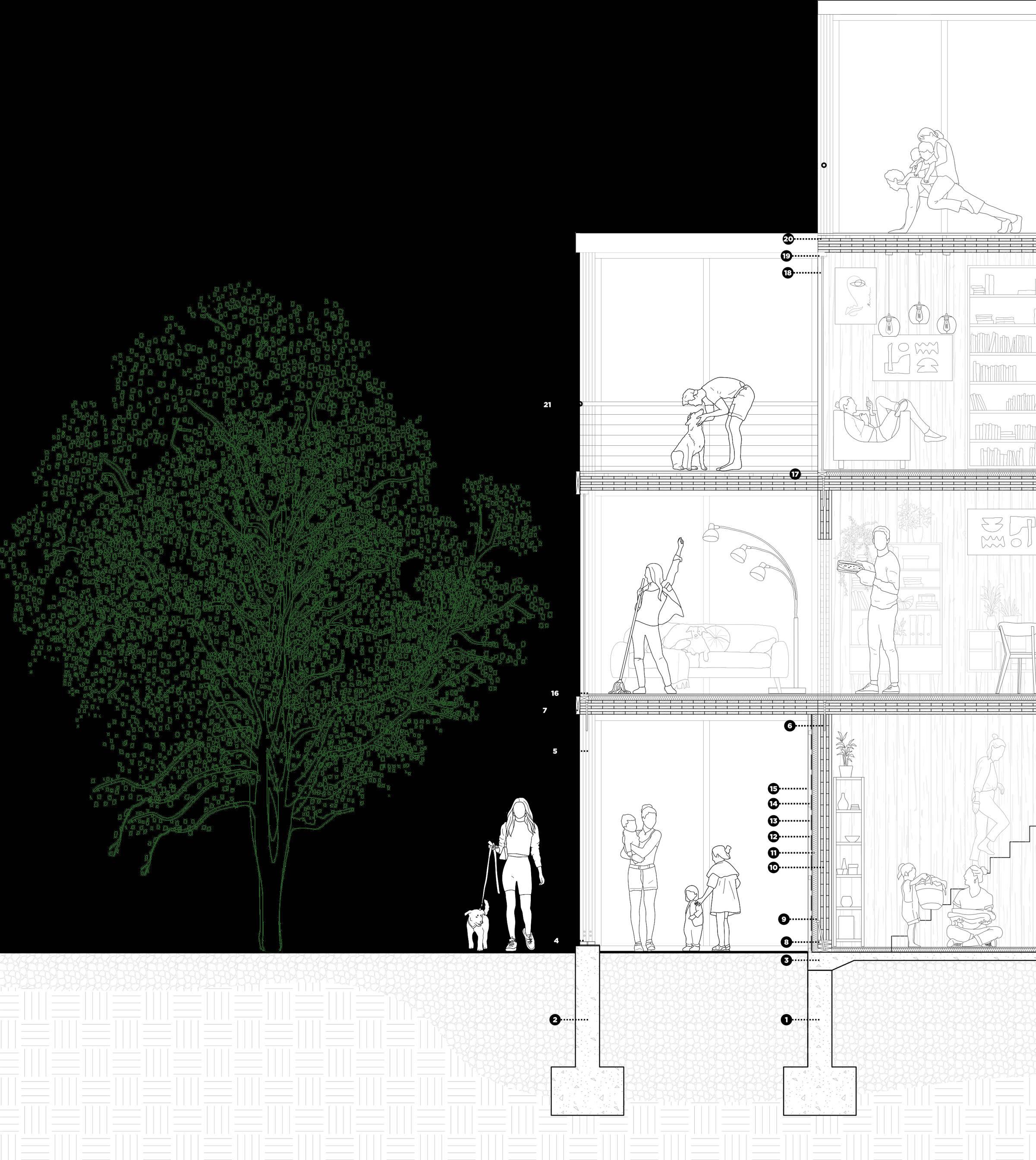 A standardized division system present in the prototypes as well as the separation of the facade from the unitary division of the plans allows for diversification.Even though each facade type uses a standard division for structure, aesthetic differences allow for a more varied urban-scape.
