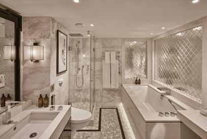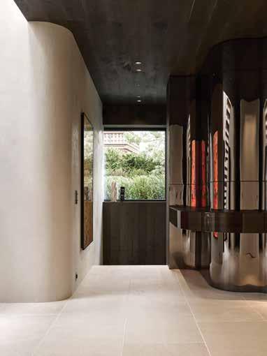 Im oberen Geschoss setzt sich das ganzheitliche Konzept fort, mit einem Bett von Hästens, umrahmt von Metall- und Ledereinsätzen. Das Bad besticht durch den Einsatz von hellem Naturstein, nur die Armaturen von Vola setzen sich davon ab. Eine besondere Note erhält das Bad durch eine mit einem Grauspiegel verkleidete Wand mit Facettenschliff, die den Waschtisch aus Naturstein perfekt zur Geltung bringt.