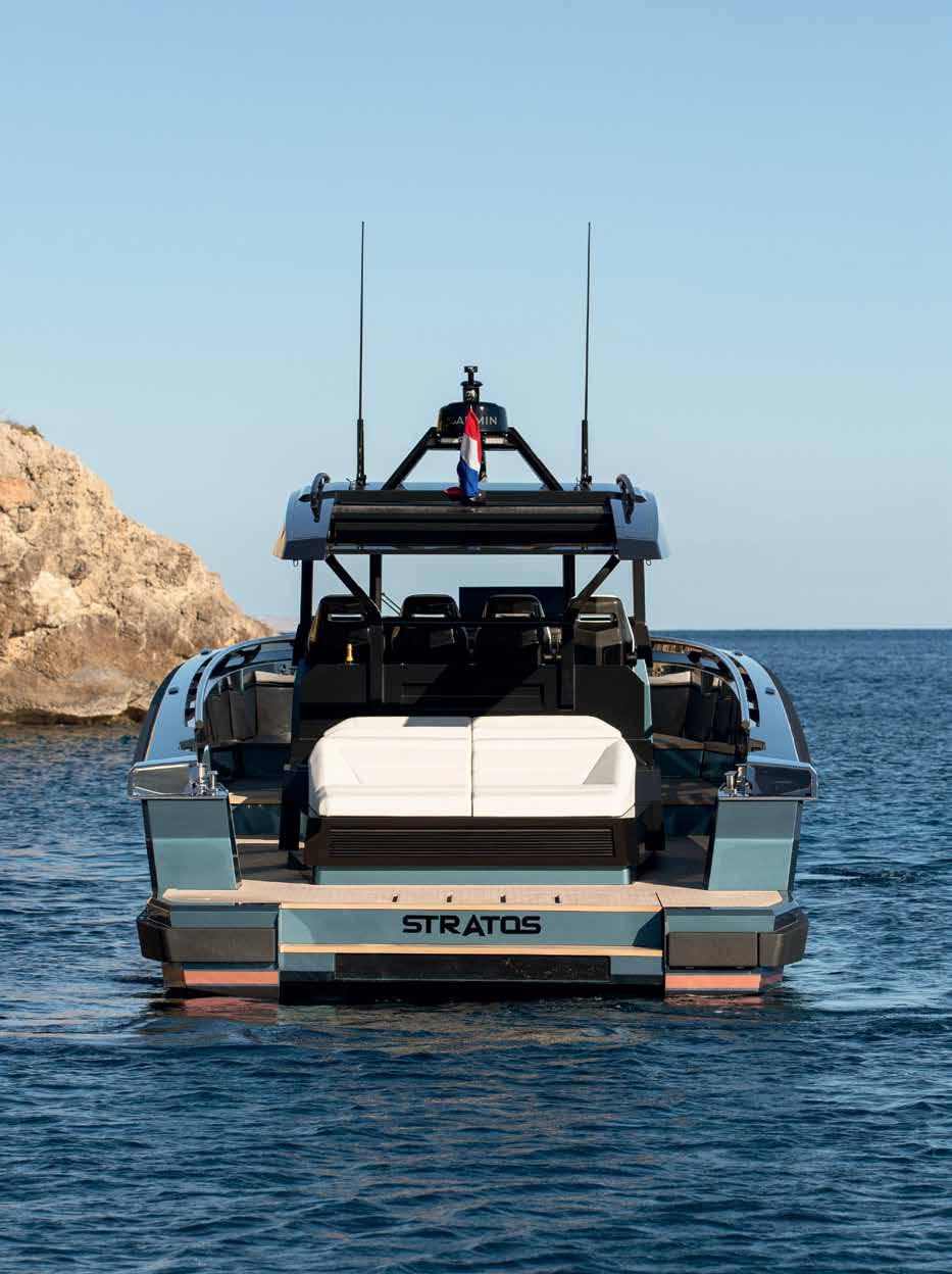 Die Highlights der Stratos sind unzählbar. Eine kleine Auswahl: Das Carbon-Hardtop lässt sich per Knopfdruck öffnen und schließen. Etwas, das bei Yachten dieser Länge nicht üblich ist. Es wurde viel in die Schalldämmung investiert, damit Sie das Meer optimal genießen können. So sind zum Beispiel der Maschinenraum und der Innenraum durch einen schallgedämmten Technikraum getrennt, ein klimatisierter separater Raum, in dem die gesamte Elektronik untergebracht ist. Für ein personalisiertes Äußeres steht eine Auswahl an etwa fünfundzwanzig metallischen und nicht-metallischen Farben zur Verfügung
