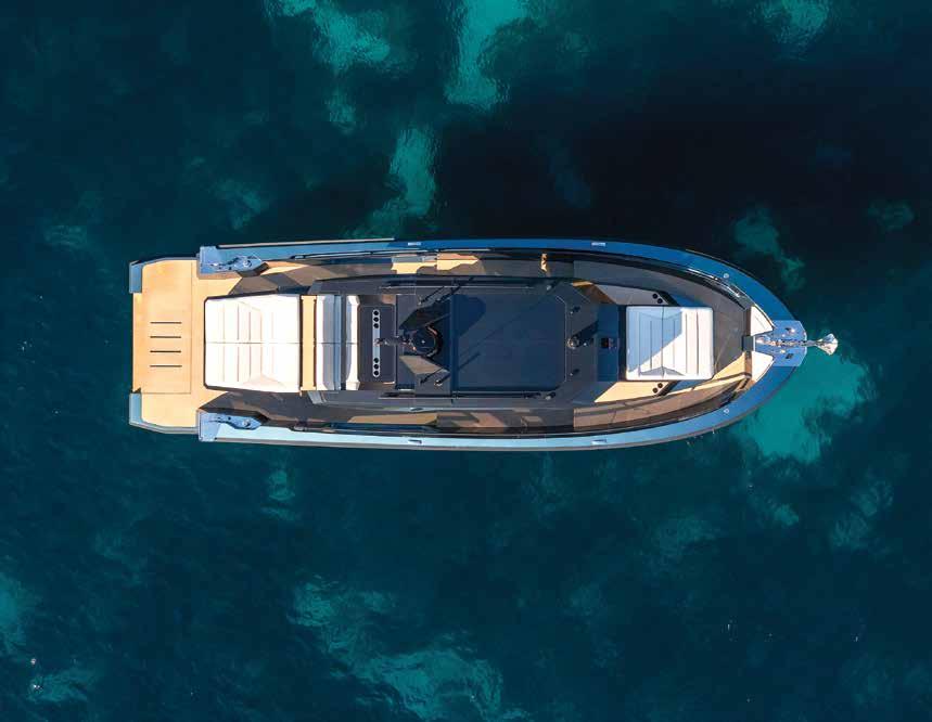 Dank des tiefen V-förmigen Rumpfes schneidet die Yacht durch das Wasser wie ein Messer durch Butter. Selbst bei hohen Wellen ist „Slamming“ mit dieser Yacht kein Thema. Einzigartig sind auch die speziell entwickelten ergonomischen Pilotensitze mit integrierter Stoßdämpfung, die das Navigieren durch hohe Wellen jederzeit komfortabel machen. Hinter den vier bequemen Pilotensitzen befindet sich in zentraler Lage eine große Wet-Bar mit u.a. Grillplatte, Eismaschine, Weinkühler, zwei Kühlschränken und Spülbecken. Auf dem Achterdeck befindet sich eine großzügiger Sitzbereich, in dem sechs Personen gemeinsam eine Mahlzeit genießen oder einfach nur gemütlich faulenzen können. Über dem Maschinenraum befindet sich eine große Doppelliege mit integriertem Stauraum für alle Wassersportgeräte, die Sie sich vorstellen können.