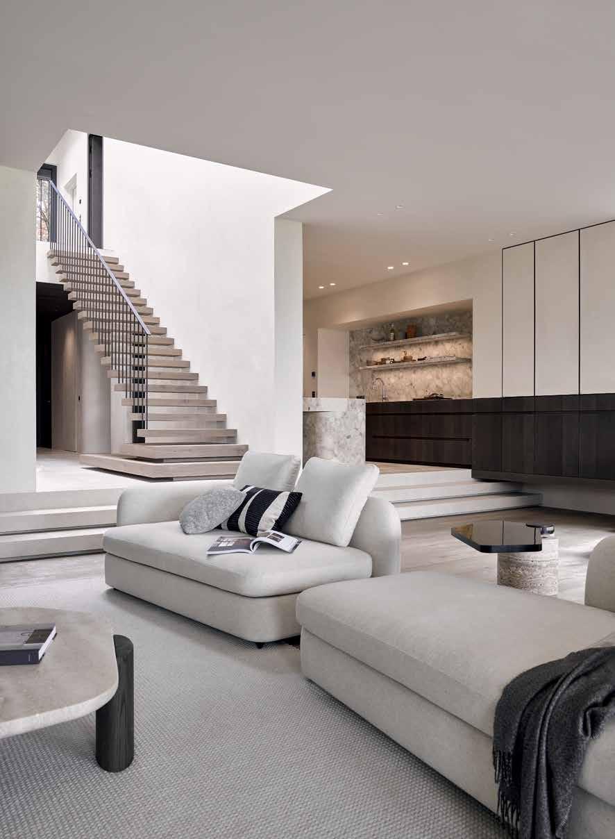 Bereits beim Betreten des Hauses wird deutlich, in welche Richtung sich das Interieur entwickelt. Der großzügige Wohnbereich mit hellem Mobiliar öffnet sich nahtlos zum Außenbereich mit traumhafter Aussicht in die natürliche Umgebung. Die Verwendung von heller Eiche für den Boden und die Treppe bildet eine ideale Kulisse für die einladenden Sitzmöbel und Tische von Delcourt sowie Polstermöbel Saint Germain von Poliform. Dunkle Kontraste in Form von Tisch- und Stuhlbeinen sowie verschiedenen Tischplatten setzen lebendige Akzente. Ein dunkles Eichenholzband an der Wand schafft einen geschmeidigen Übergang zur erhöhten Küche, die mit vertikalen Fronten in Spachteltechnik und Naturstein Breccia ausgestattet ist.