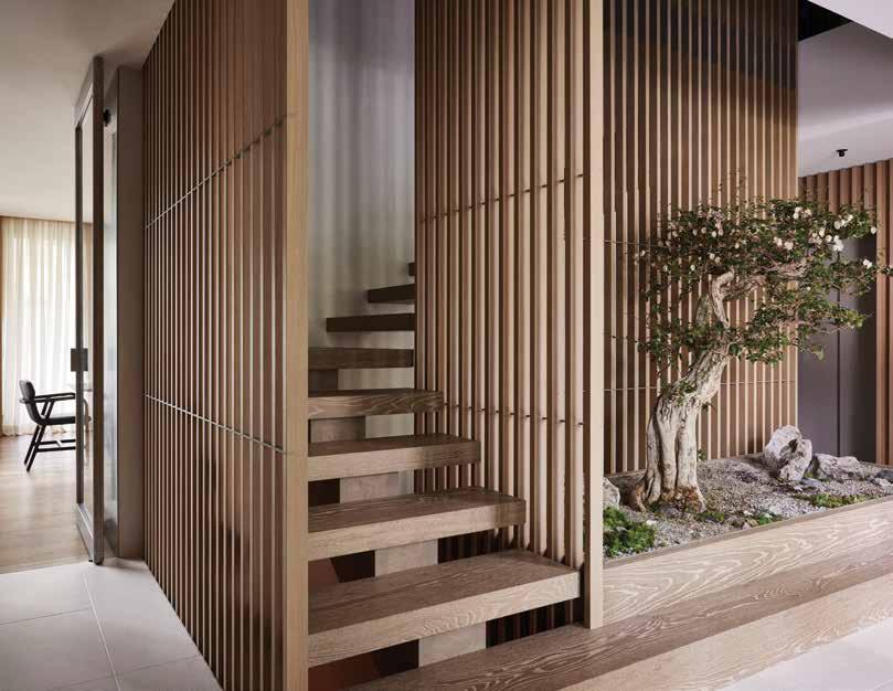 bleiben jede Kante und jede Ecke kompromisslos präzise, wie man es aus der japanischen Handwerkskunst kennt, die stets Disziplin vermittelt und bewusst auf jede Art von Verzierung verzichtet, aber intelligente und ästhetisch ansprechende Lösungen bietet. Es gilt „weniger ist mehr“ – ein Prinzip, das die Lebenseinstellung des Auftraggebers widerspiegelt, dessen Wunsch es war, allem eine Funktion zu geben und auf Überflüssiges zu verzichten. Gelungen ist dies den Designern, indem das Wesentliche in den Mittelpunkt gerückt wurde. Der Grundriss wurde überarbeitet, um mehr Licht und Offenheit in die Villa zu holen, aber auch, um mehr Logik in die räumliche Abfolge und Anordnung der Zimmer zu bringen und so eine Umgebung der Ordnung und Ruhe zu schaffen.