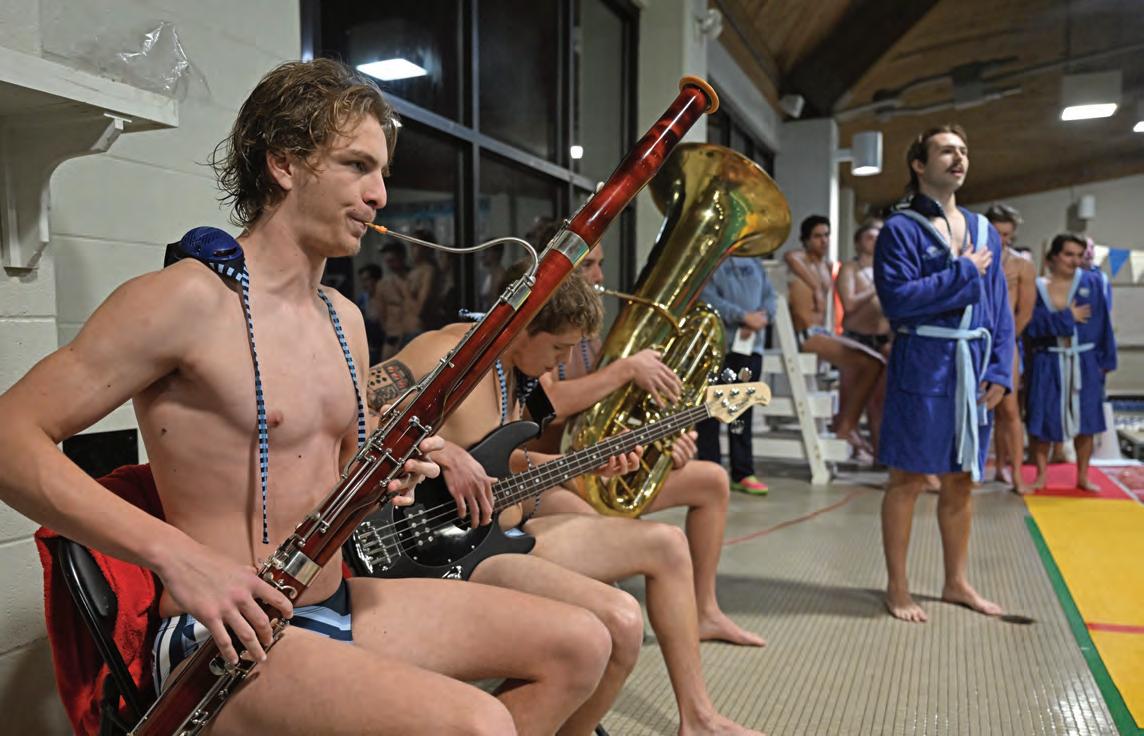 Men’s Water Polo players Paul Podrebarac ’28 (bassoon), Kale Halfacre ’29 (guitar), Jesse Ellis ’27 (tuba) and Brevin Master ’26 (voice) perform the national anthem before a meet at Lott Natatorium.