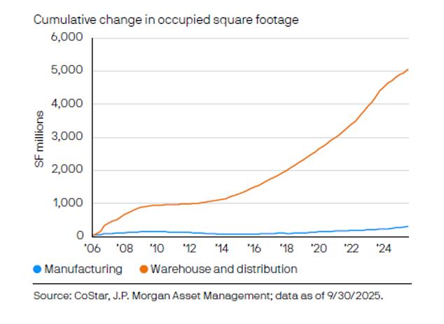 Much of the growth in the industrial market has been in logistics, warehouse, and distribution, while manufacturing has lagged. According to JPMorgan, since 2001, warehouse and distribution space in the US has grown by five billion square feet, whereas manufacturing has only added 350 million square feet. However, increased focus on reshoring critical manufacturing and supply chain resilience may catalyze demand for manufacturingoriented industrial assets.