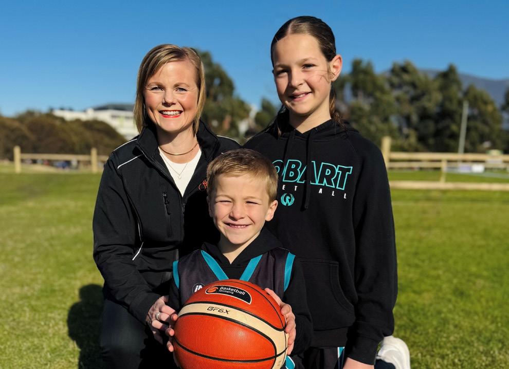Independent Member for Elwick Bec Thomas with Hobart Phoenix basketball players Jack and Matilda