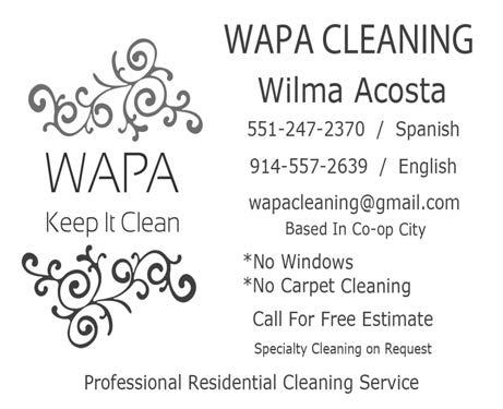 !"####### $%&%'#$()*#+(,-.#/#01)%2-3#45#!6!!###### EMERGENCY SERVICE L & L APPLIANCE REPAIR • ALL MAKES & MODELS • Stoves • Washers • Dryers •Lamps • Dishwashers • Refrigerators • Bags • Hoses • Belts • Vacuum Cleaners Family Owned & Operated Since 1954 NYC License #1233497 Fully Insured 718.792.2655 2951 Middletown Road, Bronx, NY 10461 (Near Pelham Bay Station) 10/30 APPLIANCE REPAIR CAR SERVICE !"#$%&'(#)!"*&'$)+',* !"#$%&'!()$#*&'+,-.*&' !/-001.2&'!34.-#56&'!7$4#& !(8--*'9:'!()-;156'<;;5&1$.&'' !=1#)$#*&!>5&1.$& ?'@9@ABC9ACDE@ -*.'/#?'E9DAB:FA:GCG 0*//)12##?'GBBAC:EAEEC: +H-;4*1,-+H$*1;I1%$J;$% +H-;4*1,-(-;4#1*K"#$*-;*1$.J;$% !"#$%&'()*+$",# -.,"%.$+'!$./0'12 3&45&&6#0'!7 89)$:*0';&%<*:# =*#&:.#0'>?**%# 9/24 SPOONER DOMESTIC SERVICE • Basic Cleaning $100 • Deep Cleaning $150 • Non-Medical Senior Care $90 • 4 Hour Min. + 8.88% tax • Bonded • 7 Days • Cash, Pay-Pal www.spoonercleaning.com (718) 320-5112 11/26 Advertise in the Co-op City Times! Call for Rates! Ad rates from $10/week! 718-320-3300 x3384 CLEANING SERVICES HOME IMPROVEMENT LOCKSMITH CLEANING SERVICE - WINDOWS GEORGE’S CLEAN WINDOWS Professional Window Cleaning • FAST RELIABLE SERVICE Cell: 1-203-482-6337 9/24 1-800-479-2667 CO-OP SALES - JASON LASH • HANDYMAN SERVICES • RANGE HOODS • VERTICAL & MINI BLINDS • LIGHT FIXTURES • SINK VANITIES • KITCHEN CABINETS • SPACE SAVERS • CABINET REFACING • MATCHING HAMPERS • COUNTERTOPS • BATHTUB ENCLOSURES • CUSTOM CLOSET MIRROR DOORS • CLIP-ON MIRROR FRAMES • CUSTOM WALL MIRRORS We BEAT Any Quote! CO-OP SALES BLINDS! Vertical, Mini, Wood, Pleats www.co-opsales.info 9/24 Grout & CleaningCarpet Co-op City Resident Specials 73-8)9:8.* :;(,(<8)7=>. MARY KAY CONSULTANT !"##"$%&"'(")#*$+,"--.%*$/'0"&1'2"1'3$%454$%4$)'64"7)1' !*$#78)"$)9'(4-#.)4:';;;9<"&1="19>*<?>;")#*$+@"--.%*$' AB*$4:'CDE+FGH+IEJD9'04$).*$')B.#'"%';B4$'1*7'>"889''9/24 FATHER & SON Top Quality Work - Painting, Plastering, Tiles, Walls Call Wesley 212.996.7347 or 917.325.5334 10/22 K4L4&"8'#<"88'=.)>B4$'"558."$>4#'.$'$4;'*&'MN!'O*&'%*$").*$' )*'>B7&>B?>B"&.)19'07#)'5&*L.%4'3P'"$%'&4>4.5)';.)B'$"<4'O*&' )"Q'57&5*#4#9'A.>='75'*$819'CHJ+DCG+JEGJ9'''''''''''' HI?H PAINTING FAMILY LOCKSMITH AND BLINDS NEW STYLE BLINDS Re-installation of any types of Blinds. Repair Closet Doors and Sell New Bi-Fold Doors! 9/24 COMPUTER CONSULTANT & REPAIR !"#$%&'#()*+,-.$#$.+&/$#0#,+1$&2. R45".&'S'N5@&"%4'S'P")"'R4>*L4&1'S'T.&7#'R4<*L"8' 'U"5)*5'VL4&+ B4")#' '!&">=4%'K>&44$' '6&*=4$'A*;4&'W">=' 'X&"$#O4&'1*7&'>"##4))4' )"54'<7#.>')*'!P#9'$8;;#?8,-.#"@"&!A4&@@BC5#B4A&D!@&@DD!E 2/18 RECORDS WANTED Old Records Wanted. Will Pay Top $$ for JAZZ, JAZZ, JAZZ, Rock & Roll, Soul Music, Latin, 50s, 60s, & 70s. LP, 78 or 45. Call Joe 917-952-440811/5 CLASSIFIEDS +%#FGH-3)(.-I#B4A&D!6&DD66#JDDA@# 11)(,-.K3(H-328*1%3'E1%, 9/24 DONATION/FREE REUPHOLSTERY REUPHOLSTERING 718.881.7691 STYLISH DECORATORS Custom Craftsmen – 40 yrs. experience. Sofas & Chairs upholstered; Slipcovers - Fabric & Plastic; Kitchen Chairs - $8.99 & up. Caning; Venetian Blinds; Drapes - Custom 9/24 9/24 9/17 HANDYMAN CLEANING SERVICES (CONTINUED) 9/24 9/24 O. entic Cleaning Services Residential & Commercial Cleaning -Maintenance Cleaning -Deep Cleaning -Special Projects & Organizing -Events Cleaning We provide High Quilty & Professional work (929) 215-3339 Contact@othenticcleaning.com othenticcleaning.com 100% Satisfaction Guarantee IF IT’S NOT AUTHENTIC IT’S NOT US 9/10 LAUNDRY SERVICE