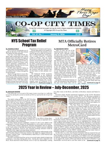 2025 Year in Review – July-December, 2025 By ROZAAN BOONE (The following is an account of the major events occurring in or affecting Co-op City during the second six months of 2025 as reported by the Co-op City Times.) July The initial voting period in the 2025 Riverbay Board of Directors election was to end on Tuesday, July 8, 2025 at 9 p.m., but as of Thursday, July 3, only 2,123 of the 5,041 ballots needed for quorum had been received by the independent election vendor, YesElections. The 2025 Election Committee co-chairs, Board Directors Monique Coleman and Leah Graham, urged shareholders to return their election ballots. By mid-July, the Election Committee extended the election deadline to July 29. In their weekly election messages to shareholders, the election co-chairs encouraged shareholders to vote to make the quorum so votes can be counted. They stressed this year’s election theme, CommUNITY in an effort to bring shareholders together, to recognize that each and every one has an important role in the governance of the community. Riverbay Board election Candidates’ Forums #1 and 2 were added to the corporation’s YouTube channel for shareholders to view at their convenience. The Riverbay Finance department informed shareholders that an upgrade to the Yardi system to facilitate the annual Income Affidavit process impacted surcharge calculations, however, the corrected surcharge amounts would be reflected on the August carrying charge statement. Riverbay Board President Rod Saunders announced his endorsements in the 2025 Riverbay Board of Directors election. He added his support behind the Stronger Together team – Leah Richardson, Idalia Reyes, Leslie Peterson and Anika Green-Watson. The MTA increased local bus service on several routes aimed at improving commuters’ wait times during peak times. Among the routes impacted were Bx23, Bx28 and Bx38 which directly serve Co-op City shareholders, among