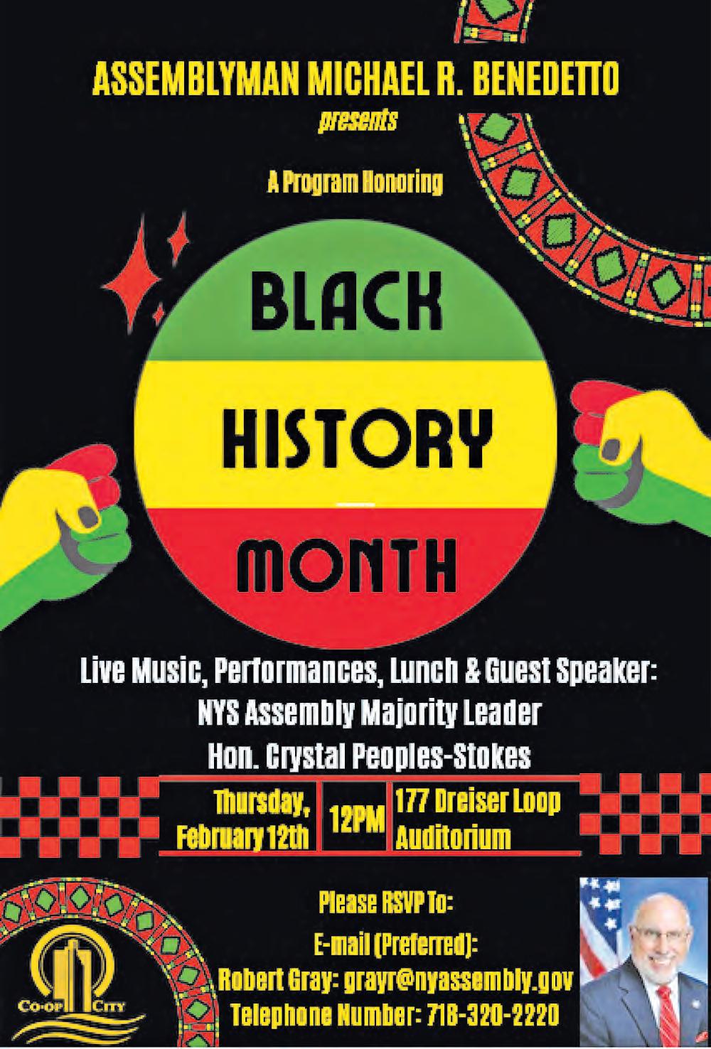On February 12, at 12 p.m., in the Dreiser Auditorium, Assemblyman Michael Benedetto will host a program honoring Black History Month. Come out to enjoy live music, performances, lunch, and special guest speaker NYS Assembly Majority Leader Hon. Crystal Peoples-Stokes. To RSVP, email grayr@nyassembly. gov or call 718-320-2220.