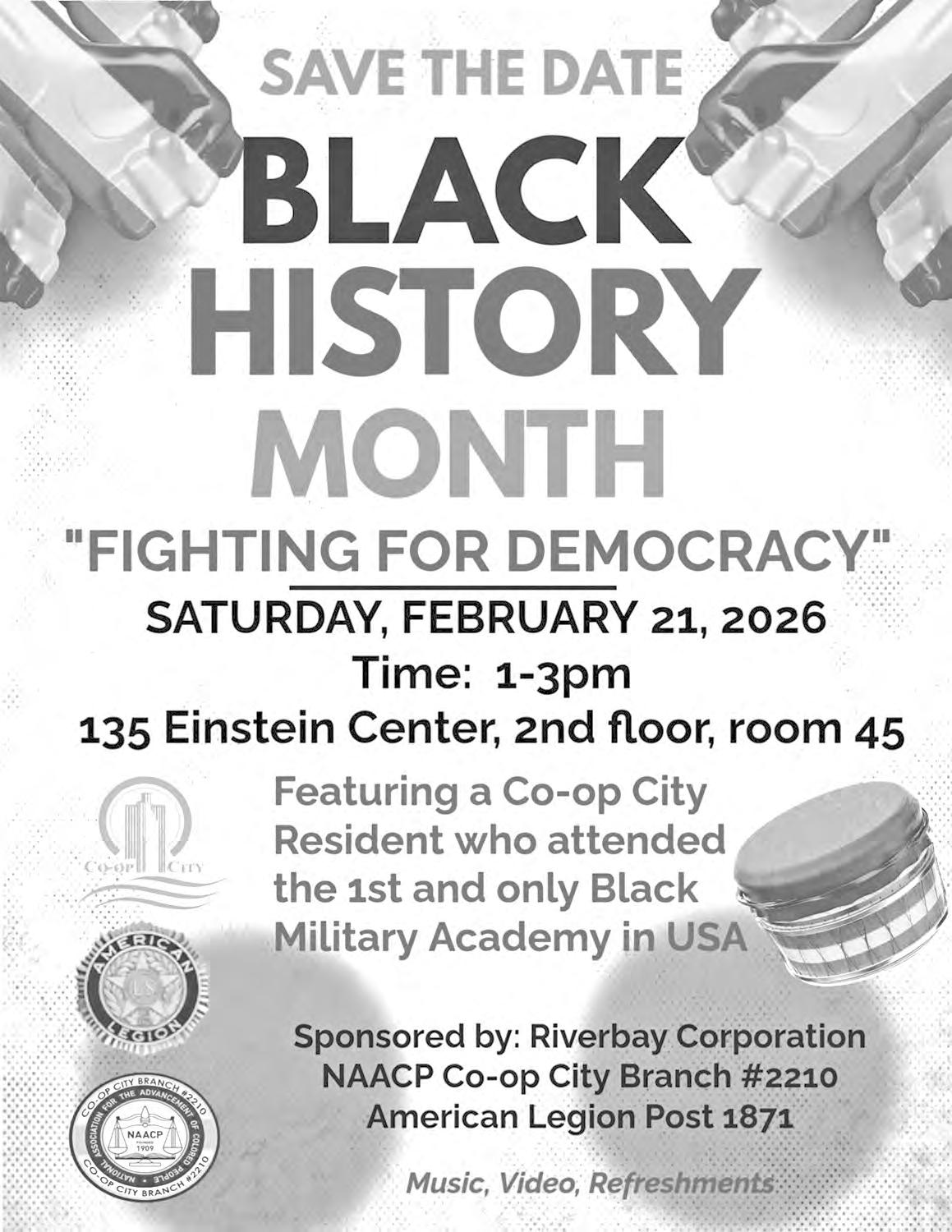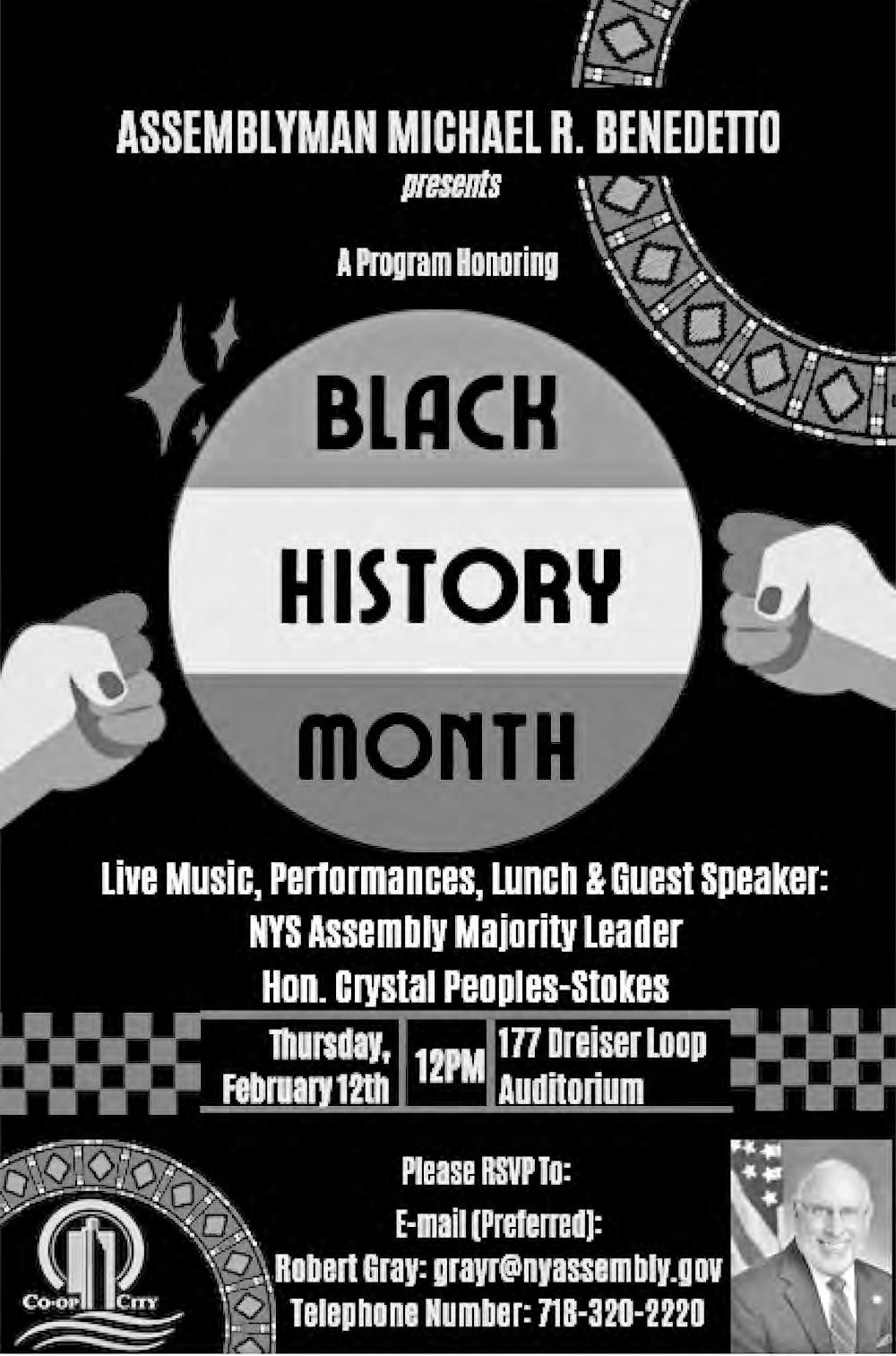 On February 12, at 12 p.m., in the Dreiser Auditorium, Assemblyman Michael Benedetto will host a program honoring Black History Month. Come out to enjoy live music, performances, lunch, and special guest speaker NYS Assembly Majority Leader Hon. Crystal Peoples-Stokes. To RSVP, email grayr@nyassembly. gov or call 718-320-2220.