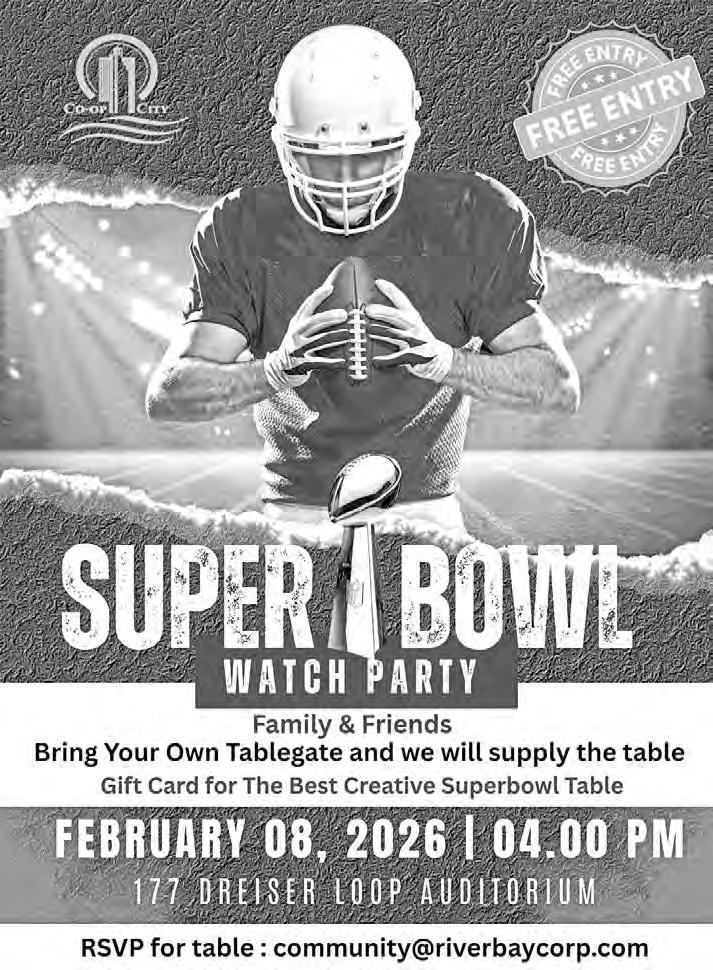 Join us for a Super Bowl Watch Party on Sunday, February 8, at 4 p.m., in the Dreiser auditorium. Bring your family and friends to enjoy this exciting event. Show off your creative skills and design your own tablegate (tables will be supplied). The Best Creative Superbowl Table will win a gift card. To RSVP, email community@riverbaycorp.com.
