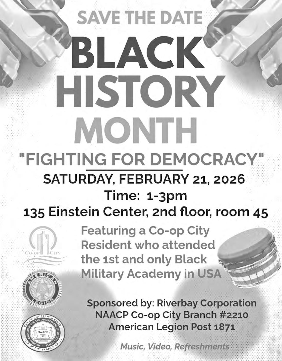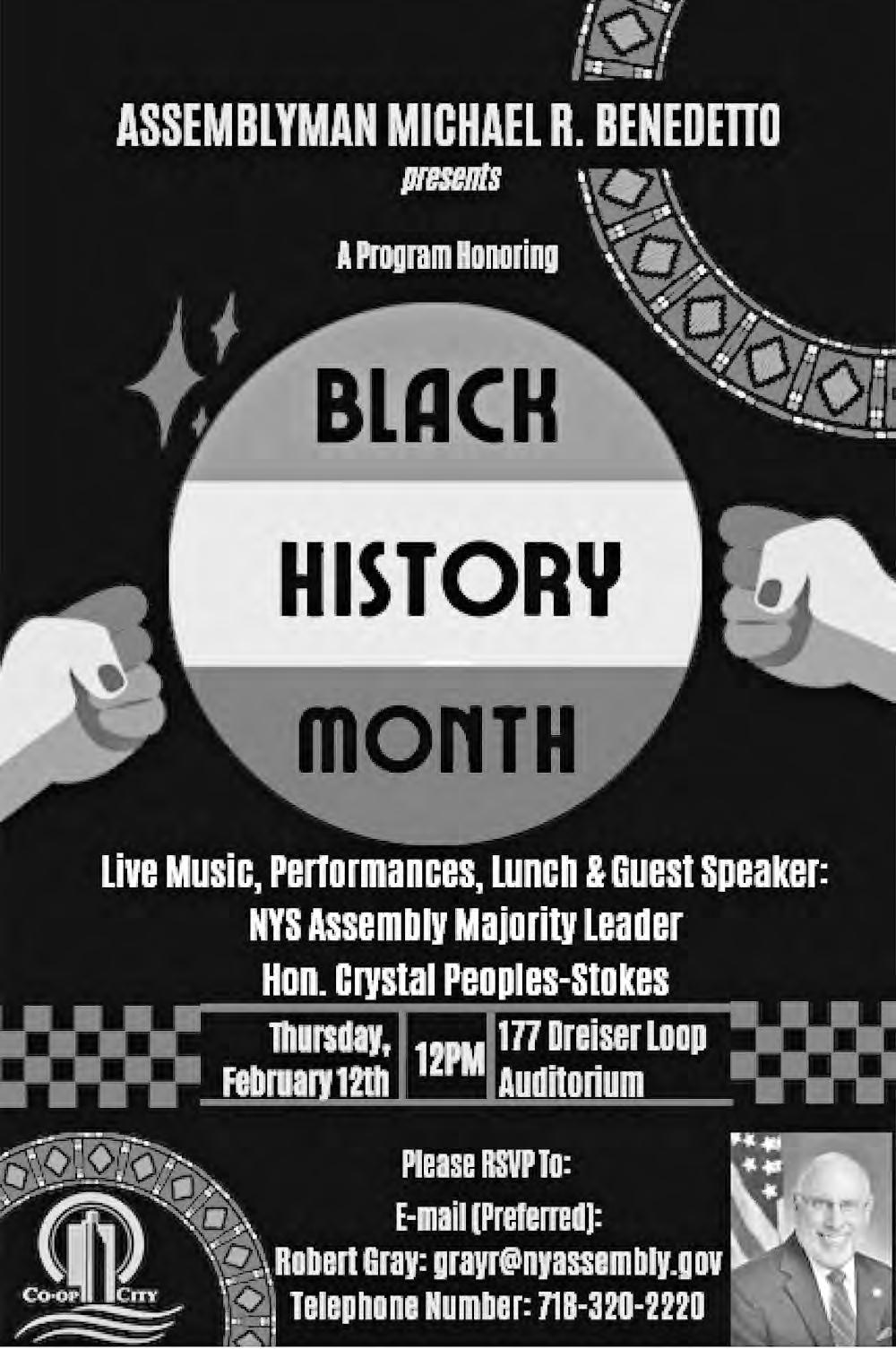 On February 12, at 12 p.m., in the Dreiser Auditorium, Assemblyman Michael Benedetto will host a program honoring Black History Month. Come out to enjoy live music, performances, lunch, and special guest speaker NYS Assembly Majority Leader Hon. Crystal Peoples-Stokes. To RSVP, email grayr@nyassembly. gov or call 718-320-2220.