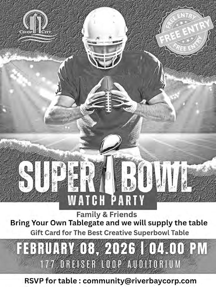 Join us for a Super Bowl Watch Party tomorrow, February 8, at 4 p.m., in the Dreiser auditorium. Bring your family and friends to enjoy this exciting event. Show off your creative skills and design your own tablegate (tables will be supplied). The Best Creative Superbowl Table will win a gift card. To RSVP, email community@riverbaycorp.com.