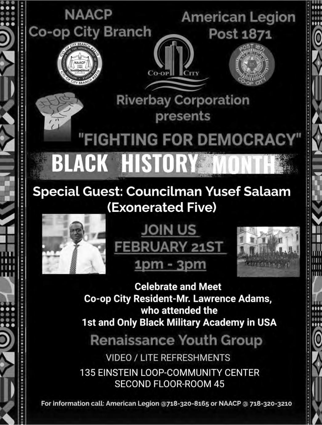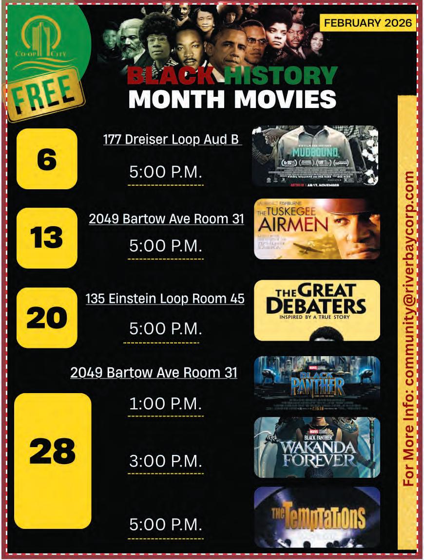 Riverbay Community Relations department presents the following movies in celebration of Black History Month: Feb. 20, Einstein Center, Rm. 45 – The Great Debaters, 5 p.m. Feb. 28, Bartow Center, Rm. 31 – Black Panther, 1 p.m.; Black Panther: Wakanda Forever, 3 p.m.; The Temptations, 5 p.m. Admission is free. For more information, email community@riverbaycorp.com.