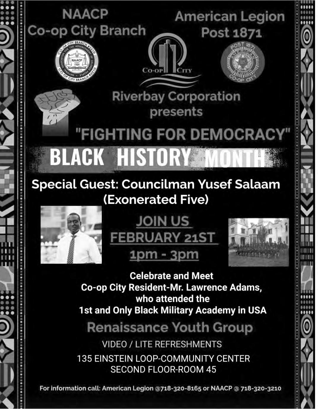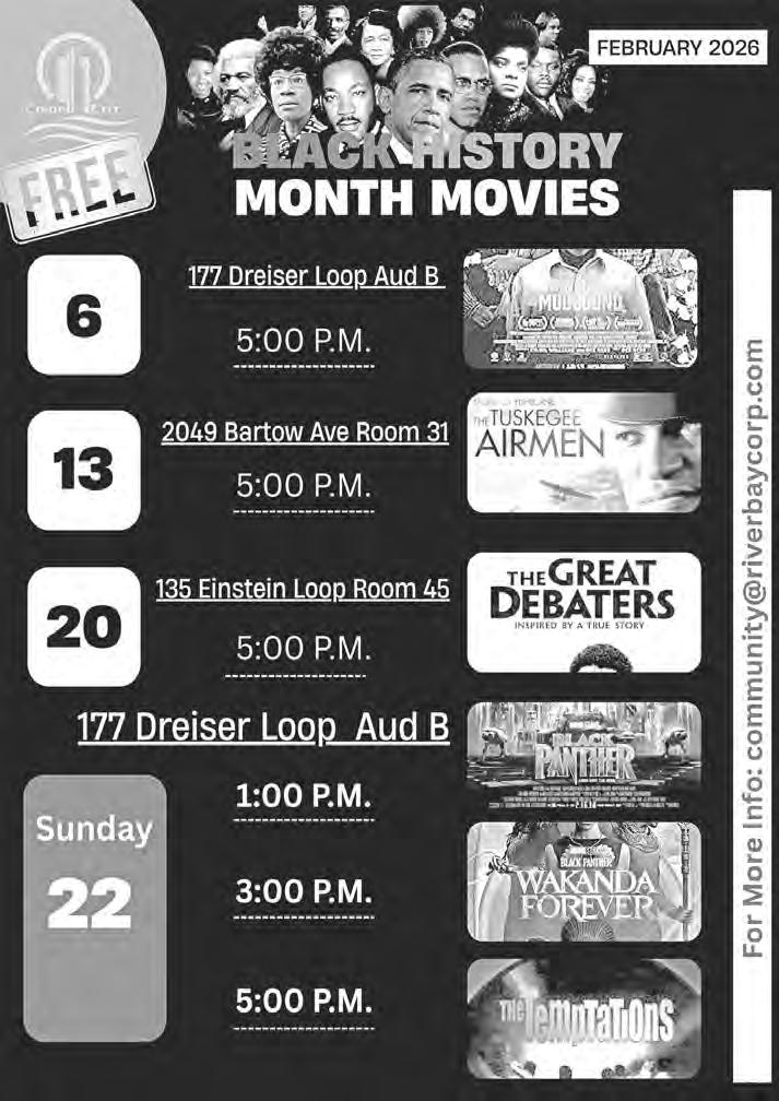 Riverbay Community Relations department presents the following movies in celebration of Black History Month: Feb. 22, Dreiser Auditorium B – Black Panther, 1 p.m.; Black Panther: Wakanda Forever, 3 p.m.; The Temptations, 5 p.m. Admission is free. For more information, email community@ riverbaycorp.com.