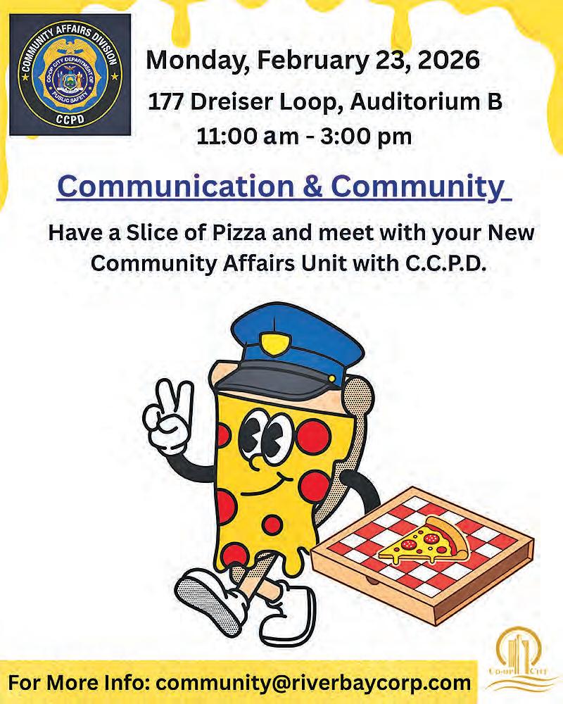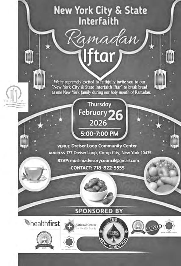 Riverbay Corporation and New York City & State Interfaith invite all to come out to the “New York City & State Interfaith Iftar” on Thursday, February 26, from 5-7 p.m., in the Dreiser Community Center. To RSVP, email muslimadvisorycouncil@ gmail.com. For more information contact 718-822-5555. Come out to break bread as one New York family.