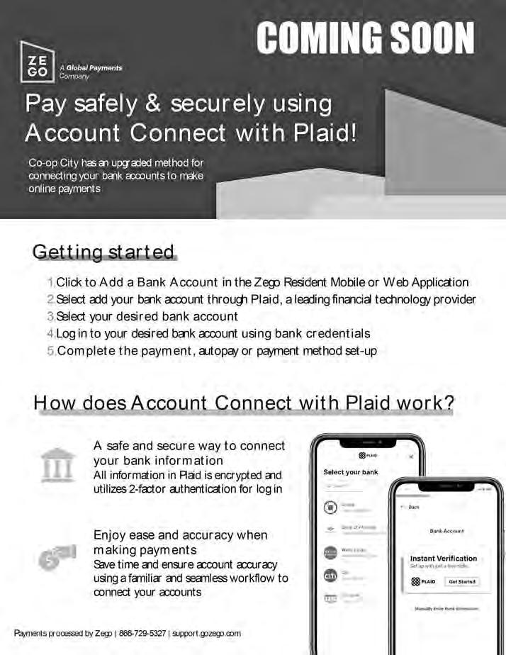 PLAID provides a secure method for shareholders to link their bank accounts directly to ZEGO/Paylease using their existing online banking credentials. During each transaction, PLAID verifies account status and available funds. If a shareholder has insufficient funds in their bank accounts, the payment will be automatically declined, protecting the corporation from NSF losses and preventing related bounced check fees for shareholders. Adding PLAID to the online payment process is important and also timely since Riverbay has experienced an increase in the number of bounced checks and chargebacks during the past several months.