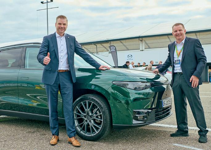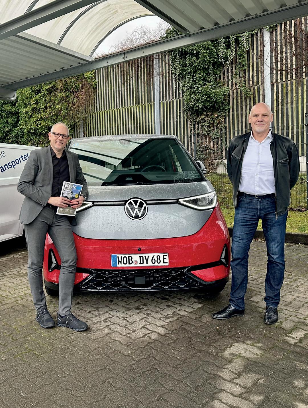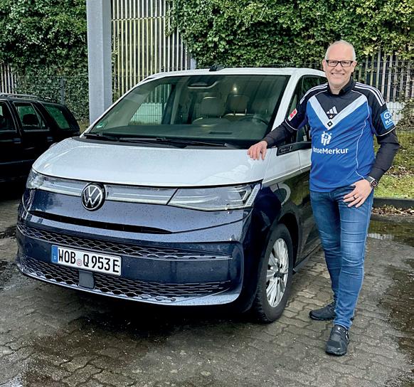 Im Topmanagement des VW-Konzerns hat Stefan Mecha (großes Foto, links) ein prallvolles Pensum zu bewältigen –als dreifacher Vater ist der 56-Jährige zudem privat stark gefordert. So präsentierte der CEO von Volkswagen Nutzfahrzeuge (VWN) am 12. März im Rahmen der Jahrespressekonferenz der VW-Markengruppe „Core“ die Geschäftszahlen des Bulli-Produzenten für 2025. Tags darauf lenkte Mecha seinen Dienstwagen vom VWNStammsitz in Hannover nach Hamburg, um sich auf dem Autohof Reimers mit electricar-Reporter Henning Krogh zu treffen. Im Interview sprach Mecha unter anderem über das weitere Ausrollen der batteriegetriebenen Nutzfahrzeuge bei VW und skizzierte aktuelle Pläne rund um Autonomes Fahren mit Moia. Der ausführliche Bericht erscheint in der nächsten Ausgabe von electricar. Das Fotoshooting bei VWN-Partner Reimers nutzte der glühende Fan des Hamburger Sport-Vereins, um sein frisch erworbenes Trikot einzuweihen (kleines Bild). Bei nordischem Schmuddelwetter, am überdachten Stellplatz für seinen –natürlich in den Vereinsfarben blau-weiß-schwarz lackierten – T7-Multivan. Am Sonnabend verfolgte Mecha dann die Bundesligapartie des HSV gegen den 1. FC Köln. Die Partie im Volksparkstadion endete mit 1:1. Nach diesem Unentschieden seines Herzensklubs zog es Mecha am Sonntag umso entschiedener in den Kreis seiner Familie.