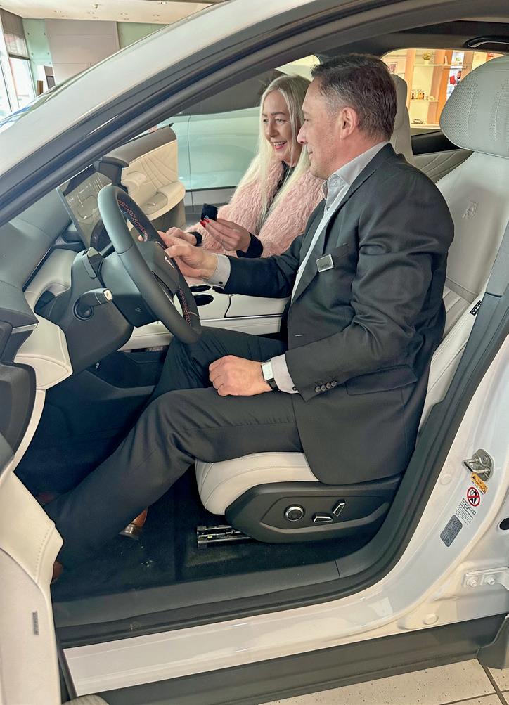 E-Mobilität neu gedacht: Alexander Uedelhoven, der Projektleiter von SUE, mit electricar-Autorin Beatrice Bohlig.