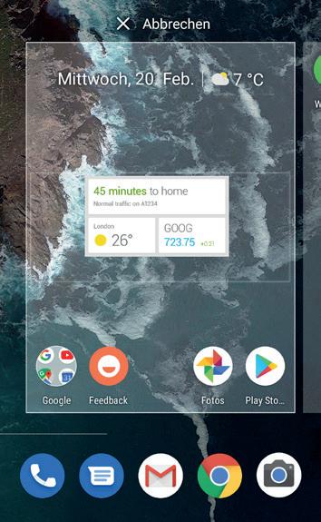 Tippen Sie auf der freien Fläche des Homescreens lange auf einen beliebigen Punkt bis sich ein kleines Fenster öffnet. In diesem tippen Sie auf „Widgets“. Im nachfolgenden Fenster wählen Sie das gewünschte Widget aus und halten dieses länger gedrückt. Nun schieben Sie es an die gewünschte Position des Homescreens.